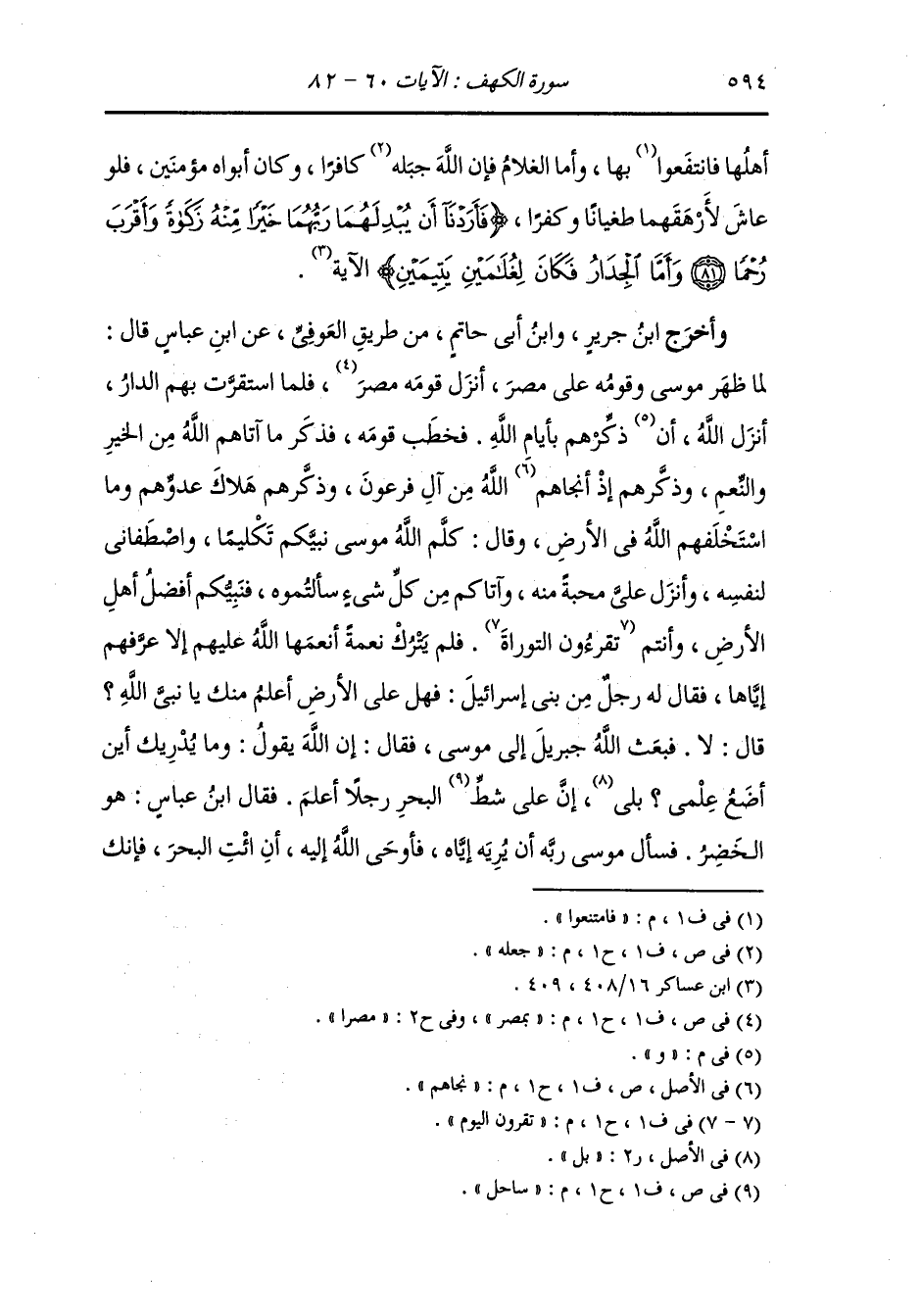 فخرجا يمشيان حتى انتهيا إلى ساحل البحر فإذا قوم قد ركبوا في سفينة يريدون أن يقطعوا البحر ركبوا معهم فلما كانوا في ناحية البحر أخذ الخضر حديدة كانت معه فخرق بها السفينة {قال أخرقتها لتغرق أهلها} الآية ، {قال ألم أقل} الآية ، {قال لا تؤاخذني} الآية ، {فانطلقا حتى إذا أتيا أهل قرية} فوجدا صبيانا يلعبون يريدون القرية فأخذ الخضر غلاما منهم وهو أحسنهم وألطفهم فقتله قال له موسى : {أقتلت نفسا زكية} الآية ، {قال ألم أقل لك} الآية ، {قال إن سألتك} الآية ، فانطلقا حتى انتهيا إلى قرية لئام
