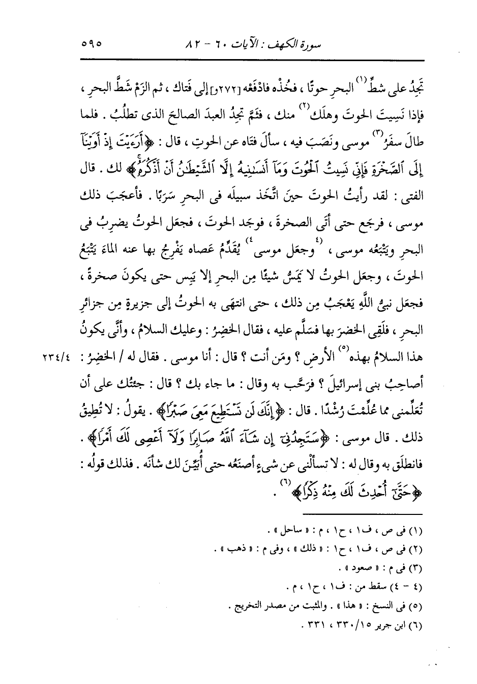 وأخرج ابن جرير ، وَابن أبي حاتم من طريق العوفي عن ابن عباس قال : لما ظهر موسى وقومه على مصر أنزل قومه بمصر فلما استقرت بهم الدار أنزل الله (وذكرهم بأيام الله) (إبراهيم آية 5) فخطب قومه فذكر ما آتاهم الله من الخير والنعيم وذكرهم إذ نجاهم الله من آل فرعون وذكرهم هلاك عدوهم وما استخلفهم الله في الأرض وقال كلم الله موسى نبيكم تكليما واصطفاني لنفسه وأنزل علي محبة منه وآتاكم من كل شيء سألتموه فنبيكم أفضل أهل الأرض وأنتم تقرون اليوم ، فلم يترك نعمة أنعمها الله عليهم إلا عرفهم إياها فقال له رجل من بني إسرائيل : فهل على الأرض أعلم منك يا نبي الله قال : لا ، فبعث الله جبريل إلى موسى فقال : إن الله يقول : وما يدريك أين أضع علمي ، بلى على ساحل البحر رجل أعلم ، قال ابن عباس : هو الخضر ، فسأل موسى ربه أن يريه إياه فأوحى الله إليه : أن ائت البحر فإنك