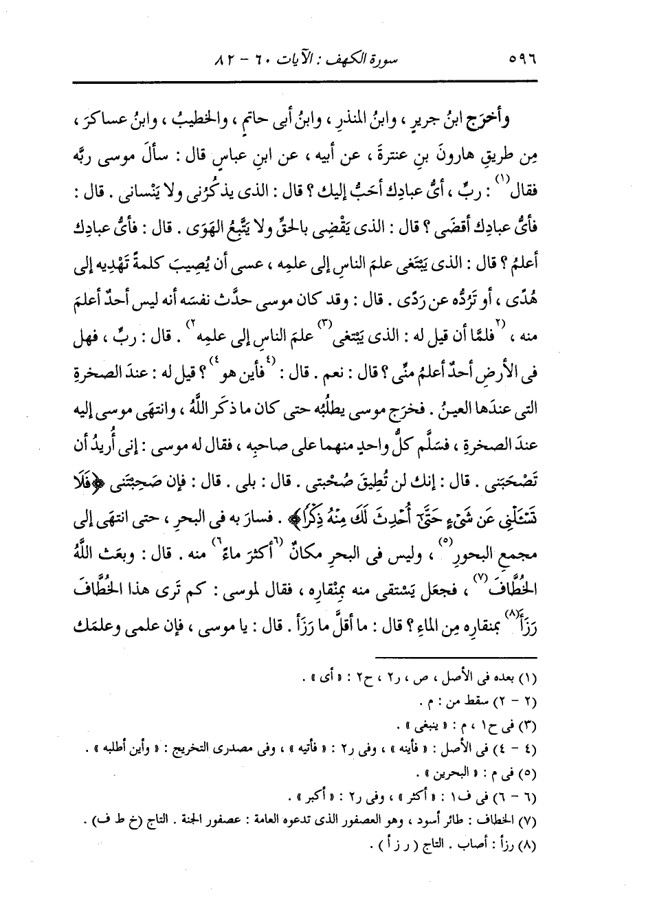 عصاه يفرج بها عنه الماء ويتبع الحوت وجعل الحوت لا يمس شيئا من البحر إلا يبس حتى يكون صخرة فجعل نبي الله يعجب من ذلك حتى انتهى الحوت إلى جزيرة من جزائر البحر فلقي الخضر بها فسلم عليه فقال الخضر : وعليك السلام ، وأنى يكون هذا السلام بهذا الأرض ، ومن أنت قال : أنا موسى ، فقال له الخضر : أصاحب بني إسرائيل فرحب به وقال : ما جاء بك قال : جئتك {على أن تعلمن مما علمت رشدا قال إنك لن تستطيع معي صبرا} يقول : لا تطيق ذلك ، قال موسى : {ستجدني إن شاء الله صابرا ولا أعصي لك أمرا} فانطلق به وقال له : لا تسألني عن شيء أصنعه حتى أبين لك شأنه ، فذلك قوله : {حتى أحدث لك منه ذكرا}.