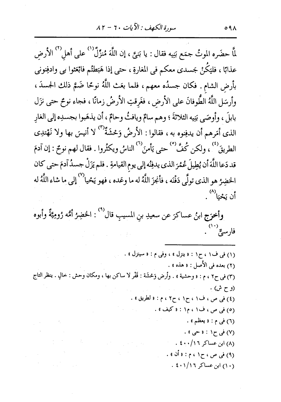 وأخرج الدارقطني في الأفراد ، وَابن عساكر من طريق مقاتل بن سليمان عن الضحاك عن ابن عباس رضي الله عنهما قال : الخضر ابن آدم لصلبه ونسئ له في أجله حتى يكذب الدجال.