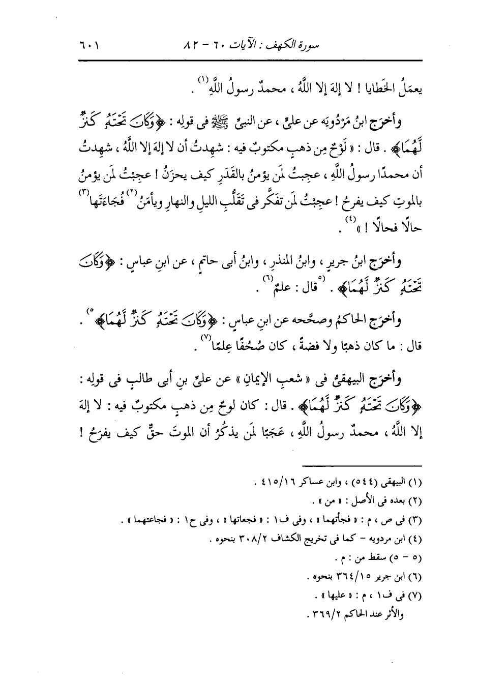 وأخرج الخرائطي في قمع الحرص ، وَابن عساكر من طريق أبي حازم عن ابن عباس في قوله تعالى : {وكان تحته كنز لهما} قال : لوح من ذهب مكتوب فيه : بسم الله الرحمن الرحيم عجبا لمن يعرف الموت كيف يفرح ، وعجبا لمن يعرف النار كيف يضحك ، وعجبا لمن يعرف الدنيا وتقلبها بأهلها كيف يطمئن إليها ، وعجبا لمن أيقن بالقضاء والقدر كيف ينصب في طلب الرزق ، وعجبا لمن يؤمن بالحساب كيف