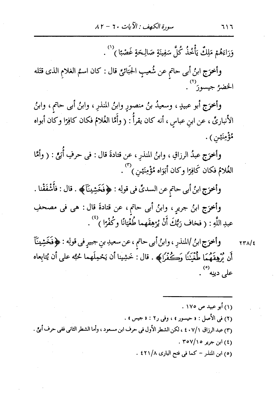 وأخرج سعيد بن منصور ، وَابن جَرِير ، وَابن أبي حاتم والحاكم وصححه ، وَابن مردويه عن ابن عباس أن النَّبِيّ صلى الله عليه وسلم كان يقرأ : وكان أمامهم ملك يأخذ كل سفينة صالحة غصبا.