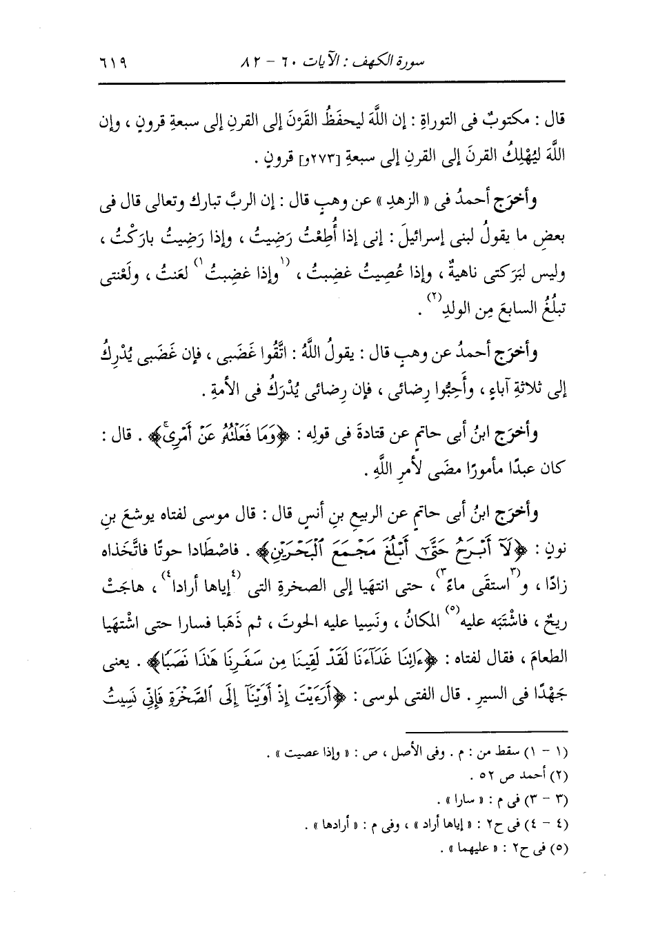 وأخرج ابن أبي شيبة وأحمد في الزهد ، وَابن أبي حاتم عن خيثمة قال : قال عيسى ابن مريم عليه السلام : طوبى لذرية مؤمن ثم طوبى لهم كيف يحفظون من بعده ، وتلا خيثمة {وكان أبوهما صالحا}.