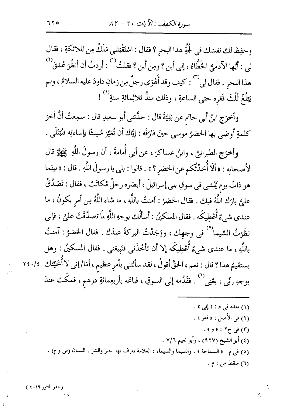 وأخرج الخطيب ، وَابن عساكر عن علي بن أبي طالب قال : بينا أنا أطوف إذا أنا برجل متعلق بأستار الكعبة وهو يقول : يا من لا يشغله سمع عن سمع ويا من لا تغلطه المسائل ويا من لا يتبرم بإلحاح الملحين أذقني برد عفوك وحلاوة رحمتك قلت : يا عبد الله أعد الكلام ، قال : وسمعته قلت : نعم ، قال : والذي نفس الخضر بيده : - وكان هو الخضر - لا يقولهن عبد دبر الصلاة المكتوبة إلا غفرت ذنوبه وإن كانت مثل رمل عالج وعدد المطر وورق الشجر.