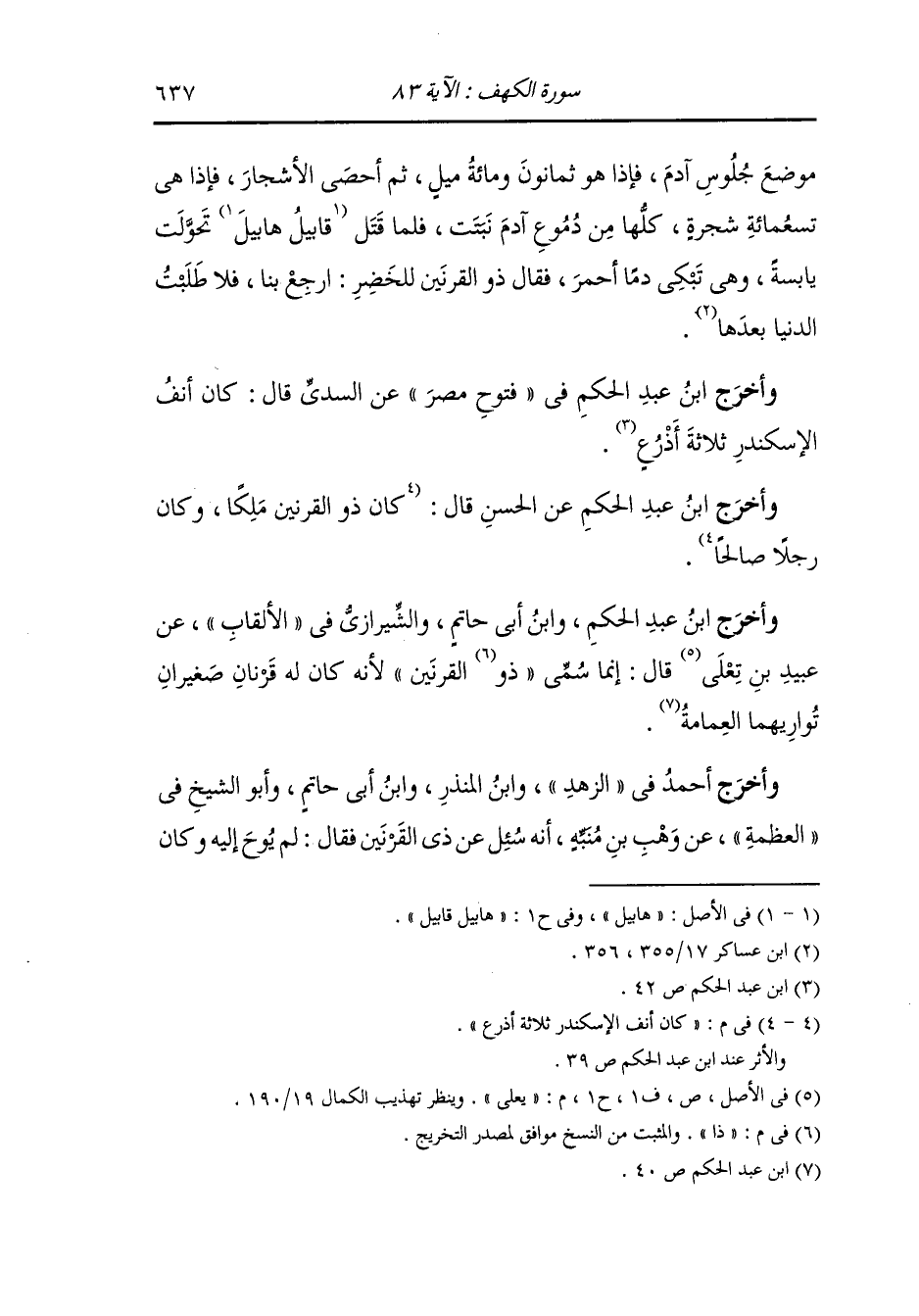 وأخرج ابن عساكر عن سليمان بن الأشج صاحب كعب الأحبار أن ذا القرنين كان رجلا طوافا صالحا فلما وقف على جبل آدم الذي هبط عليه ونظر إلى أثره هاله فقال له الخضر : - وكان صاحب لوائه الأكبر - مالك أيها الملك قال : هذا أثر الآدميين ، أرى موضع الكفين والقدمين وهذه القرحة وأرى هذه الأشجار حوله قائمة يابسة يسيل منها ماء أحمر إن لها لشأنا ، فقال له الخضر : - وكان قد أعطي العلم والفهم - أيها الملك ألا ترى الورقة المعلقة من النخلة الكبيرة قال : بلى ، قال : فهي تخبرك بشأن هذا الموضع ، - وكان الخضر يقرأ كل كتاب - فقال : أيها الملك أرى كتابا فيه : بسم الله الرحمن الرحيم هذا كتاب من آدم أبي البشر أوصيكم ذريتي وبناتي أن تحذروا عدوي وعدوكم إبليس الذي كان يلين كلامه وفجور أمنيته أنزلني من الفردوس إلى تربة الدنيا وألقيت على موضعي هذا لا يلتفت إلي مائتي سنة بخطيئة واحدة حتى درست في الأرض وهذا أثري وهذه الأشجار من دموع عيني فعلي في هذه التربة أنزلت التوبة فتوبوا من قبل أن تندموا وباردوا من قبل أن يبادر بكم وقدموا من قبل أن يقدم بكم ، فنزل ذو القرنين فمسح