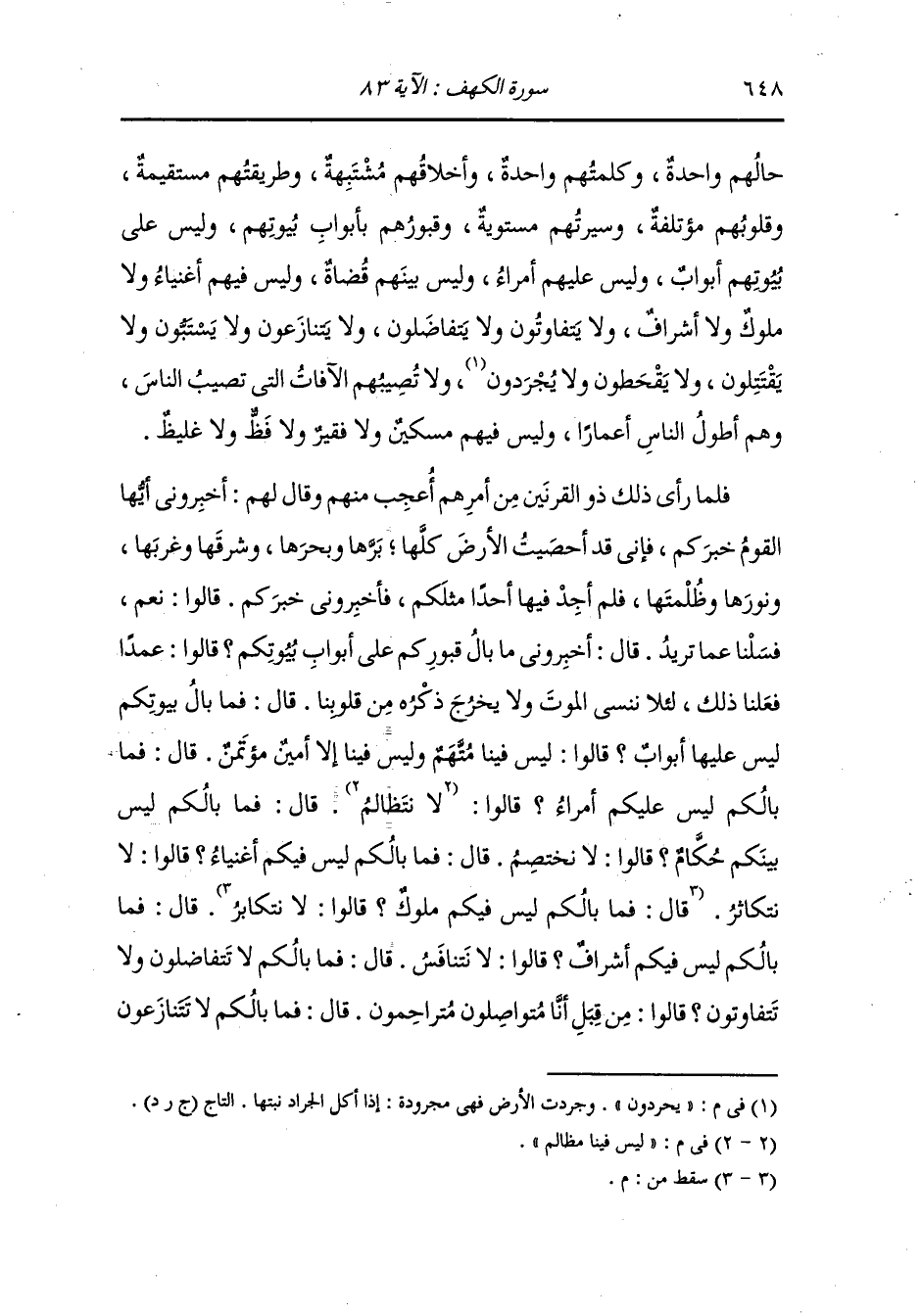 الحديد فلما فرغ منه وأحكم انطلق عامدا إلى جماعة الإنس والجن فبينما هو يسير إذ رفع إلى أمة صالحة يهدون بالحق وبه يعدلون فوجد أمة مقسطة يقتسمون بالسوية ويحكمون بالعدل ويتأسون ويتراحمون.