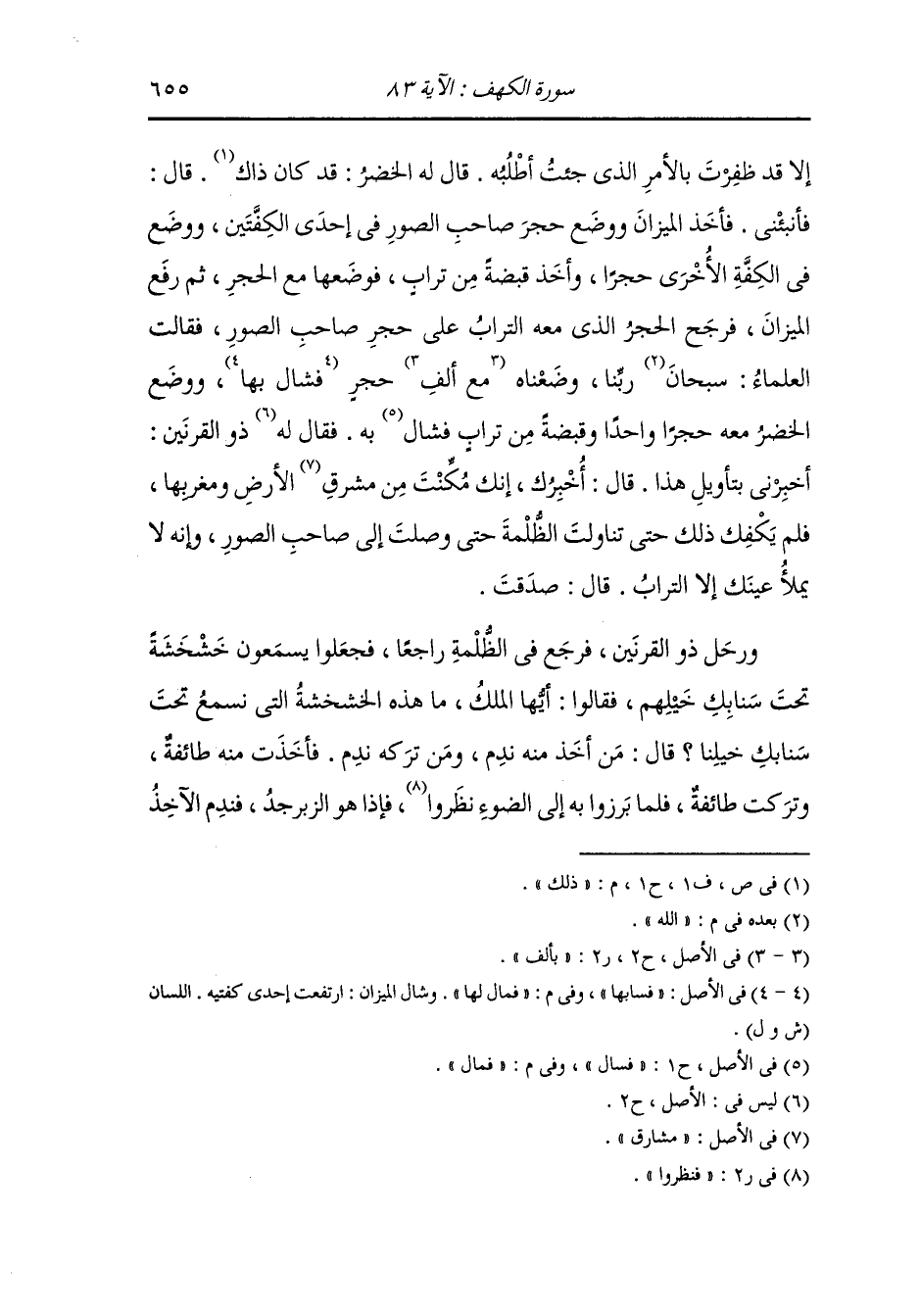 ما وراءك حتى قطعت الظلمة ووصلت إلي قال : ومن أنت قال : أنا صاحب الصور قد قدمت رجلا وأخرت أخرى ووضعت الصور على فمي وأنا شاخص ببصري إلى السماء أنتظر أمر ربي ثم تناول حجرا فدفعه فقال : انصرف فإن هذا الحجر سيخبرك بتأويل ما أردت ، فتصرف [ فانصرف ] ذو القرنين حتى أتى عسكره فنزل وجمع إله العلماء فحدثهم بحديث القصر وحديث العمود والطير وما قال له وما رد عليه حديث صاحب الصور وأنه قد دفع إليه هذا الحجر وقال : إنه سيخبرني بتأويل ما جئت به فأخبروني عن هذا الحجر ما هو وأي شيء أراد بهذا قال : فدعوا بميزان ووضع حجر صاحب الصور في أحدى الكفتين ووضع حجر مثله في الكفة الأخرى فرجح به ثم وضع معه حجر آخر رجح به ثم وضع مائة حجر فرجح بها حتى وضع ألف حجر فرجح بها فقال ذو القرنين : هل عند أحد منكم في هذا الحجر من علم قال - والخضر قاعد بحاله لا يتكلم - فقال له : يا خضر هل عندك في هذا الحجر من علم قال : نعم ، قال : وما هو قال الخضر : أيها الملك إن الله ابتلى العالم بالعالم وابتلى الناس بعضهم ببعض وإن الله ابتلاك بي وابتلاني بك ، فقال له ذو القرنين : ما أراك