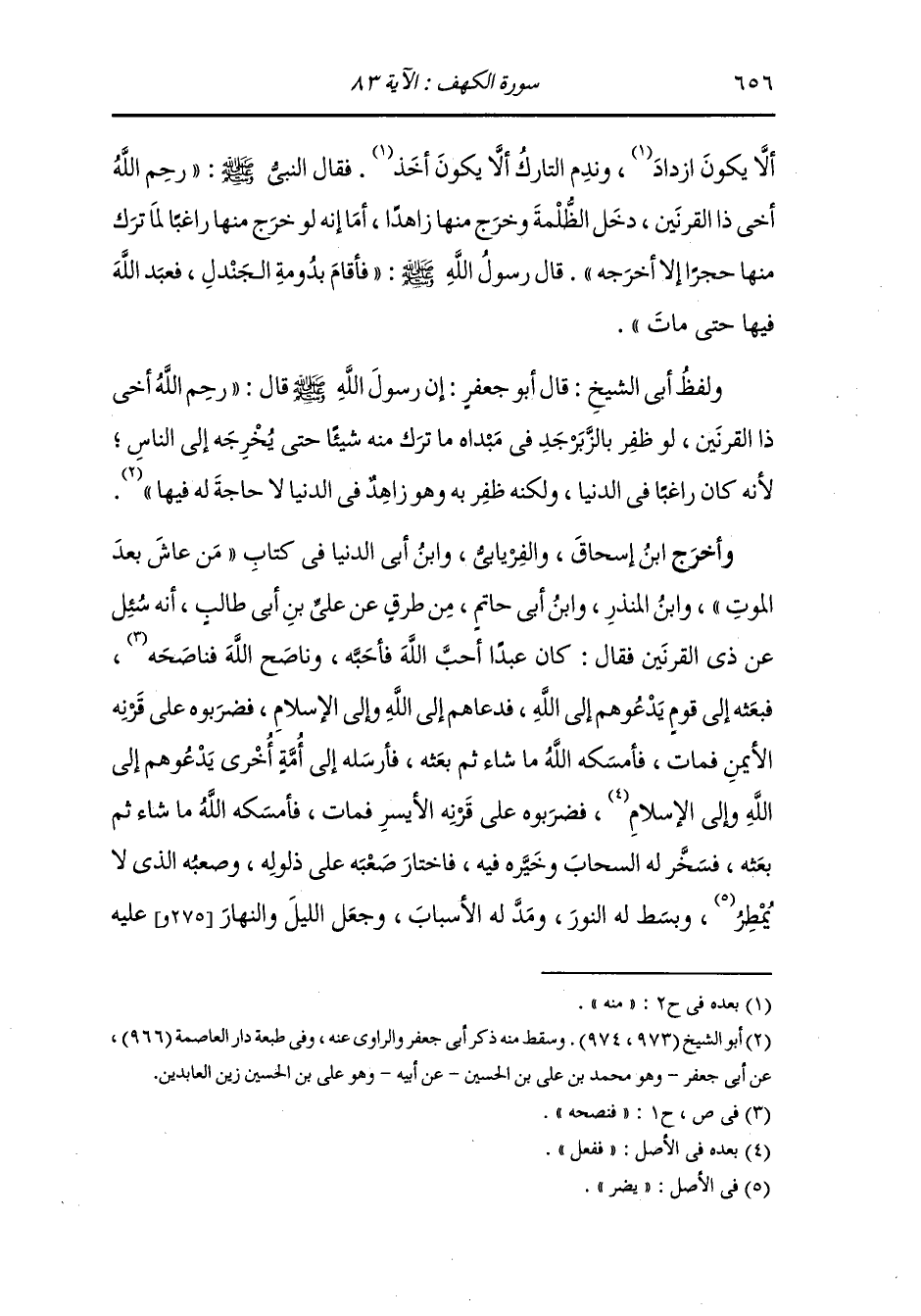 أخبرني بتأويل هذا ، قال : أخبرك ، إنك مكنت من مشرق الأرض ومغربها فلم يكفك ذلك حتى تناولت الظلمة حتى وصلت إلى صاحب الصور وإنه لا يملأ عينك إلا التراب ، قال : صدقت ، ورحل ذو القرنين فرجع في الظلمة راجعا فجعلوا يسمعون خشخشة تحت سنابك خيلهم فقالوا : أيها الملك ما هذه الخشخشة التي نسمع تحت سنابك خيلنا قال : من أخذ منه ندم ومن تركه ندم فأخذت منه طائفة وتركت طائفة فلما برزوا به إلى الضوء نظروا فإذا هو بالزبرجد فندم الآخذ