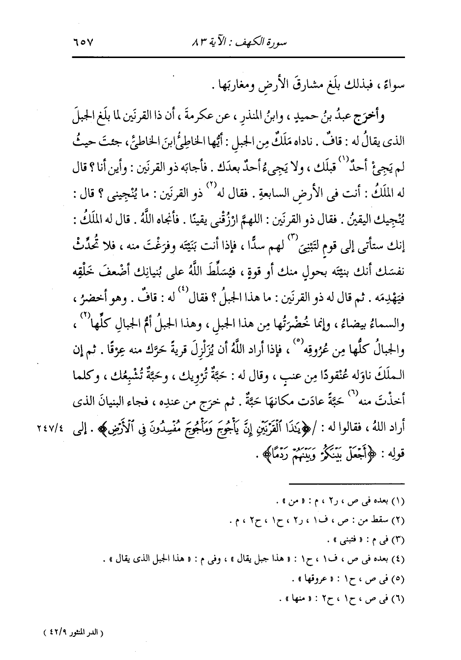 أن لا يكون ازداد وندم التارك أن لا يكون أخذ ، فقال النَّبِيّ صلى الله عليه وسلم : رحم الله أخي ذا القرنين دخل الظلمة وخرج منها زاهدا ، أما إنه لو خرج منها راغبا لما ترك منها حجرا إلا أخرجه ، قال رسول الله صلى الله عليه وسلم : فأقام بدومة الجندل فعبد الله فيها حتى مات ، ولفظ أبي الشيخ : قال أبو جعفر : إن رسول الله صلى الله عليه وسلم قال : رحم الله أخي ذا القرنين لو ظفر بالزبرجد في مبداه ما ترك منه شيئا حتى يخرجه إلى الناس لأنه كان راغبا في الدنيا ولكنه ظفر به وهو زاهد في الدنيا لا حاجة له فيها.