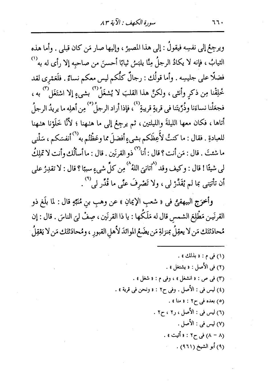 رضي الله عنه قال : كان ذو القرنين في بعض مسيره فمر بقوم قبورهم على أبواب بيوتهم وإذا ثيابهم لون واحد وإذا هم رجال كلهم ليس فيهم امرأة فتوسم رجلا منهم فقال له : لقد رأيت شيئا ما رأيت في شيء من مسري ، قال : وما هو فوصف له ما رأى منهم ، قالوا : أما هذه القبور على أبوابنا فإنا جعلناها موعظة لقلوبنا تخطر على قلب أحدنا فيخرج فيرى القبور