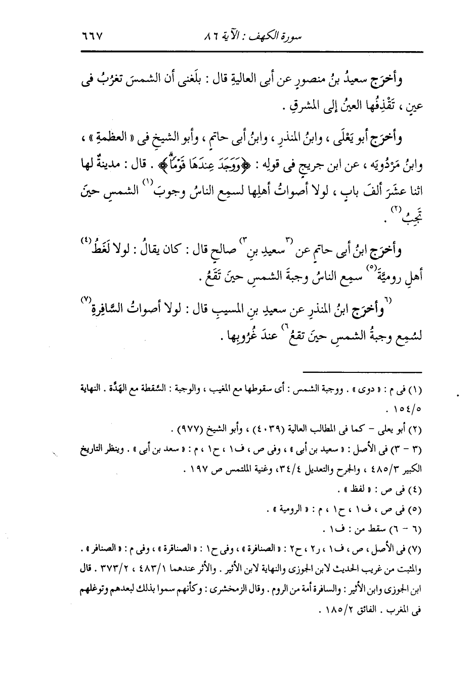 وأخرج ابن أبي شيبة ، وَابن المنذر ، وَابن مردويه والحاكم وصححه عن أبي ذر قال : كنت ردف رسول الله صلى الله عليه وسلم وهو على حمار فرأى الشمس حين غربت فقال : أتدري أين تغرب قلت : الله ورسوله أعلم ، قال : فإنها تغرب في عين حامية غير مهموزة.