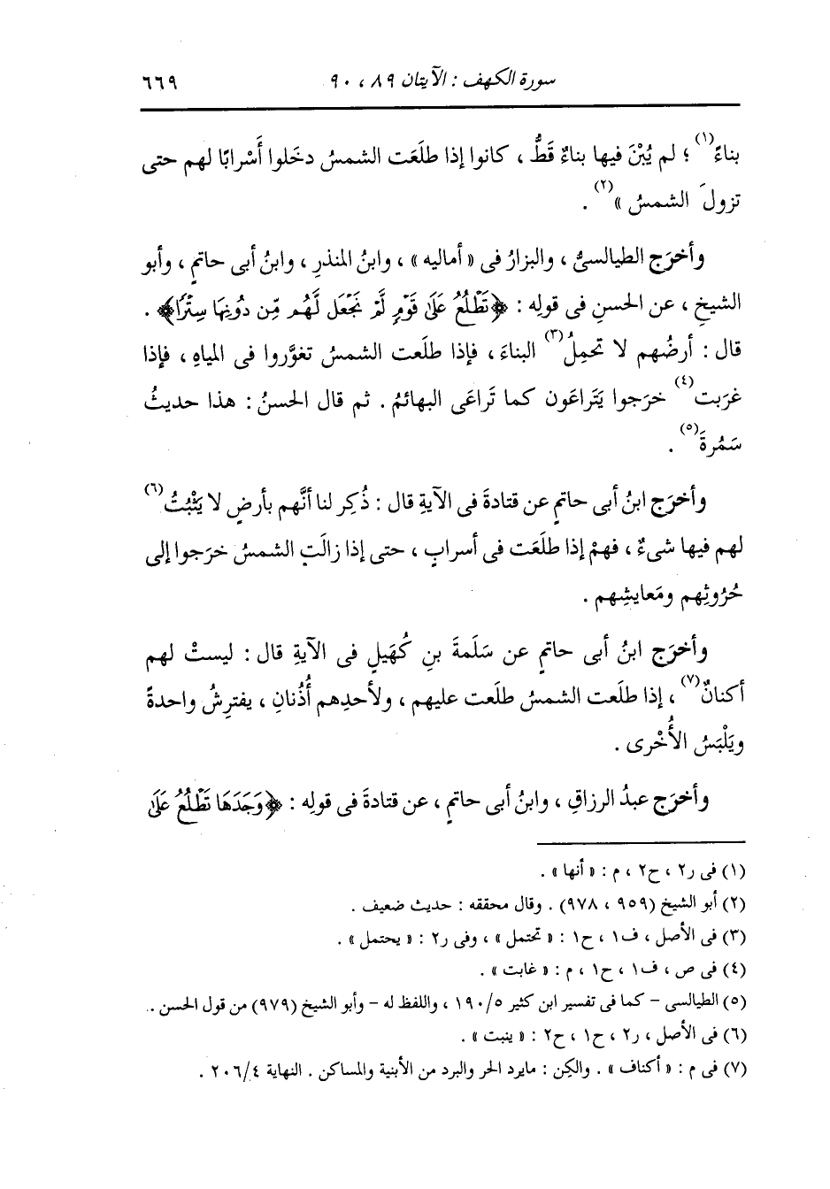 وأخرج ابن المنذر ، وَابن أبي حاتم وأبو الشيخ في العظمة عن ابن جريج في قوله : {حتى إذا بلغ مطلع الشمس} الآية ، قال : حدثت عن الحسن عن سمرة بن جندب ، قال : قال النَّبِيّ صلى الله عليه وسلم : {لم نجعل لهم من دونها سترا}