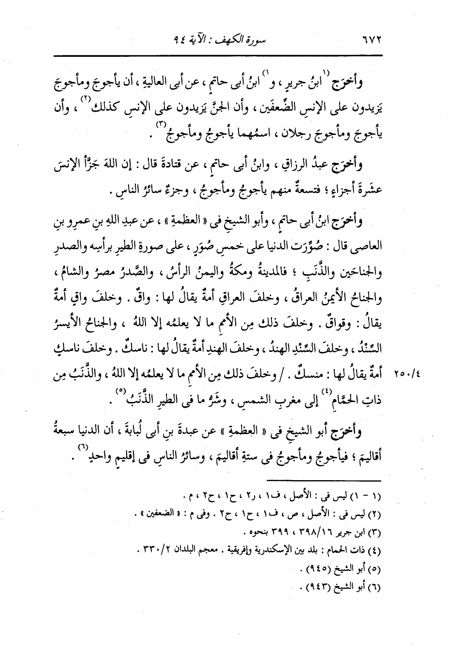 وأخرج عبد الرزاق ، وَابن جَرِير ، وَابن المنذر ، وَابن أبي حاتم والحاكم وصححه من طريق البكالي عن عبد الله بن عمر قال : إن الله جزأ الملائكة والإنس والجن عشرة أجزاء تسعة أجزاء منهم الملائكة وجزء واحد الجن والإنس ، وجزأ الملائكة عشرة أجزاء تسعة منهم الكروبيون الذي يسبحون الليل والنهار لا يفترون وجزء واحد لرسالاته ولخزائنه وما يشاء من أمره ، وجزأ الإنس والجن عشرة أجزاء فتسعة منهم الجن والإنس جزء واحد فلا يولد من الإنس ولد إلا ولد من الجن تسعة ، وجزأ الإنس عشرة أجزاء تسعة منهم يأجوج ومأجوج وجزء سائر الناس والسماء ذات الحبك ، قال : السماء السابعة والحرم بحيالة العرش.