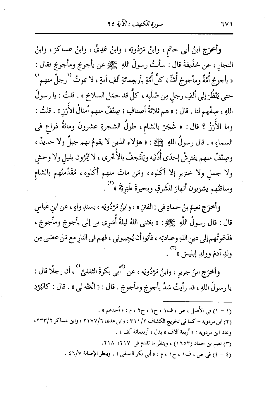 وأخرج النسائي ، وَابن مردويه من طريق عمرو بن أوس عن أبيه قال : قال رسول الله صلى الله عليه وسلم : إن يأجوج ومأجوج لهم نساء يجامعون ما شاؤوا وشجر يلقحون ما شاؤوا ولا يموت رجل منهم إلا ترك من ذريته ألفا فصاعدا.