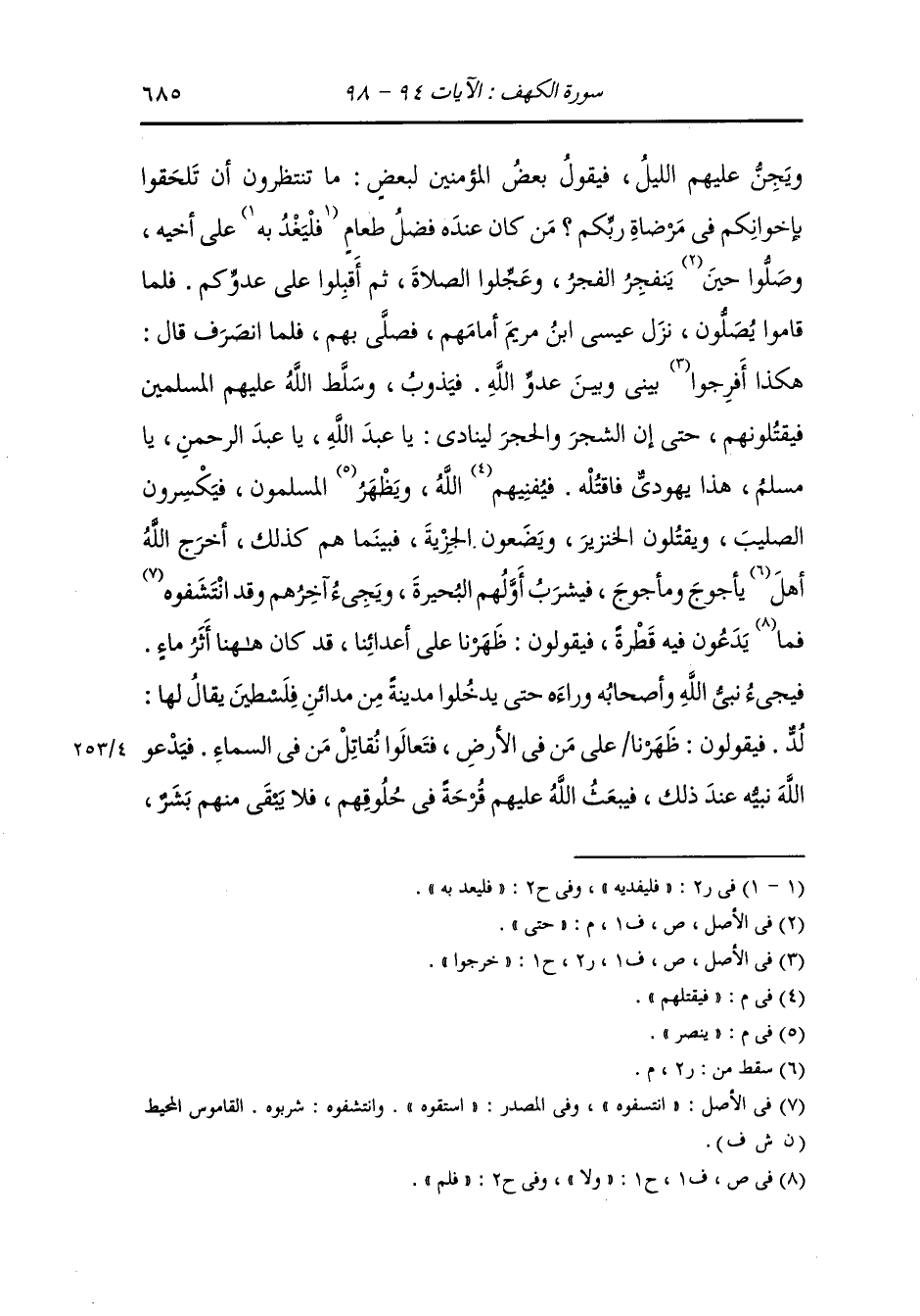 وأخرج أبو يعلى والحاكم وصححه ، وَابن عساكر عن أبي هريرة عن النَّبِيّ صلى الله عليه وسلم في السد قال : يحفرونه كل يوم حتى إذا كادوا يخرقونه قال الذي عليهم : ارجعوا ، فستخرقونه غدا ، قال : فيعيده الله كأشد ما كان حتى إذا بلغوا مدتهم وأراد الله قال الذي عليهم : ارجعوا فستخرقونه غدا إن شاء الله - واستثنى - فيرجعون وهو كهيئته حين تركوه فيخرقونه ويخرجون على الناس فيسقون المياه وينفر الناس منهم فيرمون سهامهم في السماء فترجع مخضبة بالدماء فيقولون : قهرنا أهل الأرض وغلبنا في السماء قسوة وعلوا فيبعث الله عليهم نغفا في أقفائهم فيهلكهم ، قال : والذي نفسي بيده إن دواب الأرض لتسمن وتبطر وتشكر شكرا من لحومهم.