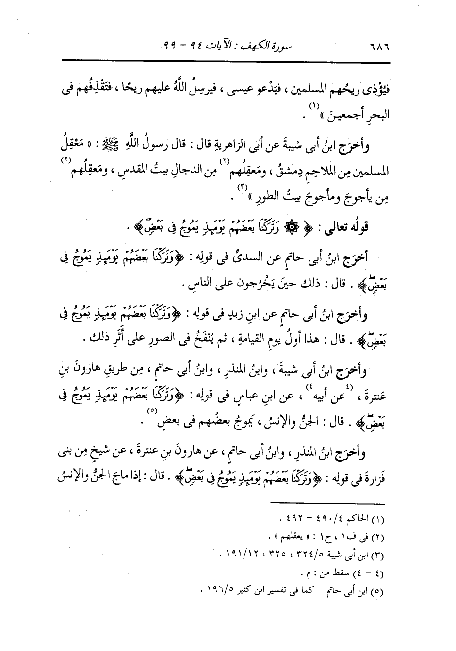 ويجن عليهم الليل فيقول بعض المؤمنين لبعض : ما تنتظرون أن تلحقوا إخوانكم في مرضاة ربكم من كان عنده فضل طعام فليغد به على أخيه وصلوا حتى ينفجر الفجر وعجلوا الصلاة ثم أقبلوا على عدوكم ، فلما قاموا يصلون نزل عيسى ابن مريم أمامهم فصلى بهم فلما انصرف قال : هكذا فرجوا بيني وبين عدو الله فيذوب وسلط الله عليهم من المسلمين فيقتلونهم حتى أن الشجر والحجر لينادي : يا عبد الله يا عبد الرحمن ، يا مسلم هذا يهودي فاقتله ، فيقتلهم الله وينصر المسلمون فيكسرون الصليب ويقتلون الخنزير ويضعون الجزية فبينما هم كذلك أخرج الله يأجوج ومأجوج فيشرب أولهم البحيرة ويجيء آخرهم وقد انتشفوه ولم يدعوا فيه قطرة فيقولون : ظهرنا على