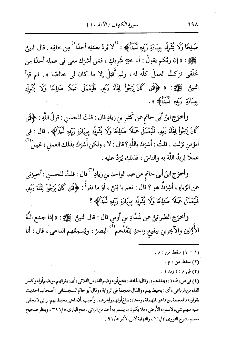 وأخرج هناد ، وَابن المنذر ، وَابن أبي حاتم والبيهقي عن سعيد في قوله : {فمن كان يرجو لقاء ربه} قال : ثواب ربه ، {فليعمل عملا صالحا ولا يشرك} قال : لا يرائي {بعبادة ربه أحدا}.