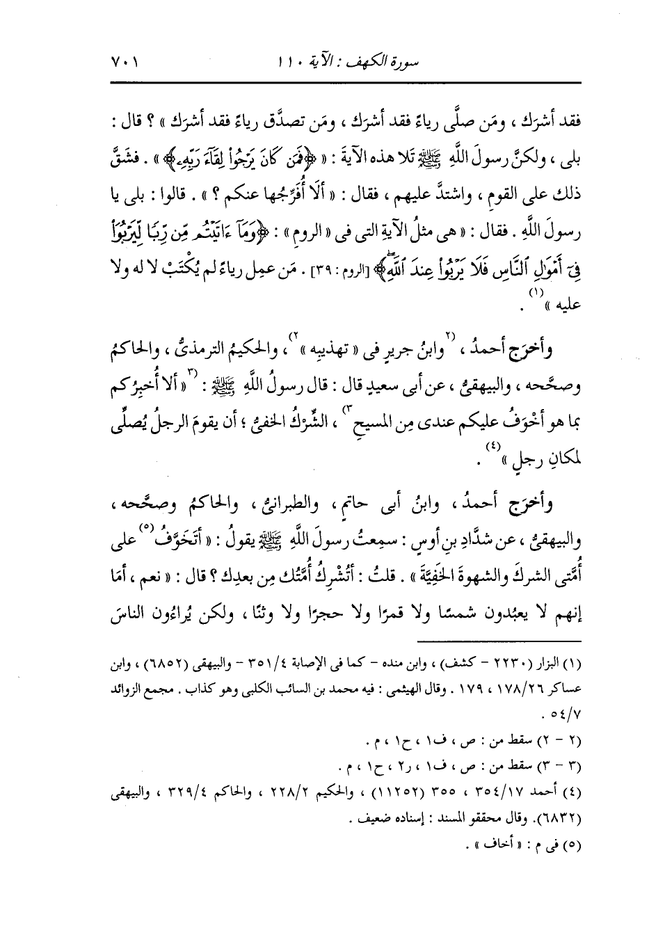 وأخرج أحمد ، وَابن أبي الدنيا ، وَابن مردويه والحاكم وصححه والبيهقي عن شداد بن أوس : سمعت رسول الله صلى الله عليه وسلم يقول : من صلى يرائي فقد أشرك ومن صام يرائي فقد أشرك ومن تصدق يرائي فقد أشرك ، ثم قرأ {فمن كان يرجو لقاء ربه} الآية.