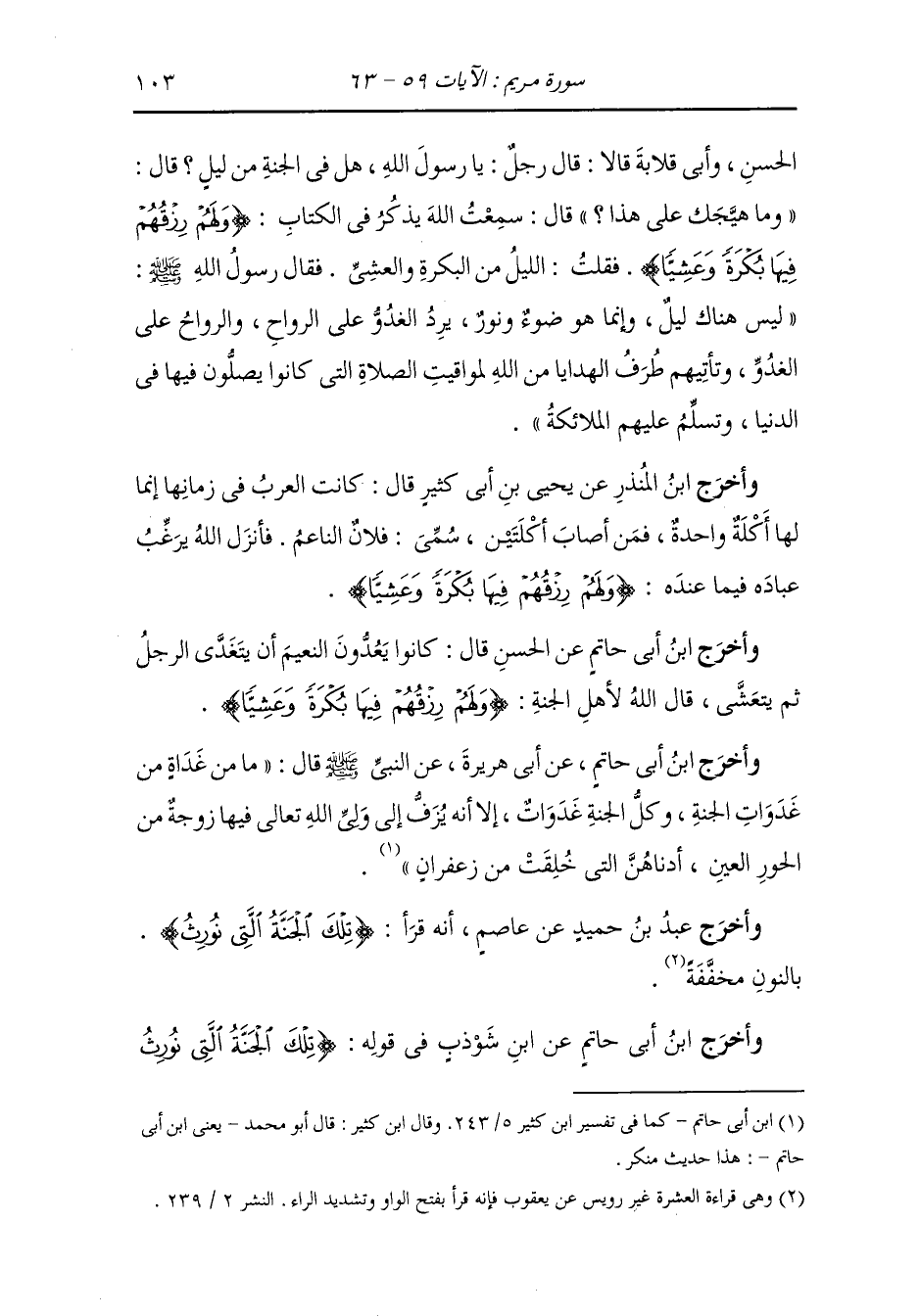 وأخرج ابن المنذر عن يحيى بن أبي كثير قال : كانت العرب في زمانها إنما لها أكلة واحدة فمن أصاب اثنتين سمي فلانا الناعم ، فأنزل الله تعالى يرغب عباده فيما عنده {ولهم رزقهم فيها بكرة وعشيا}.