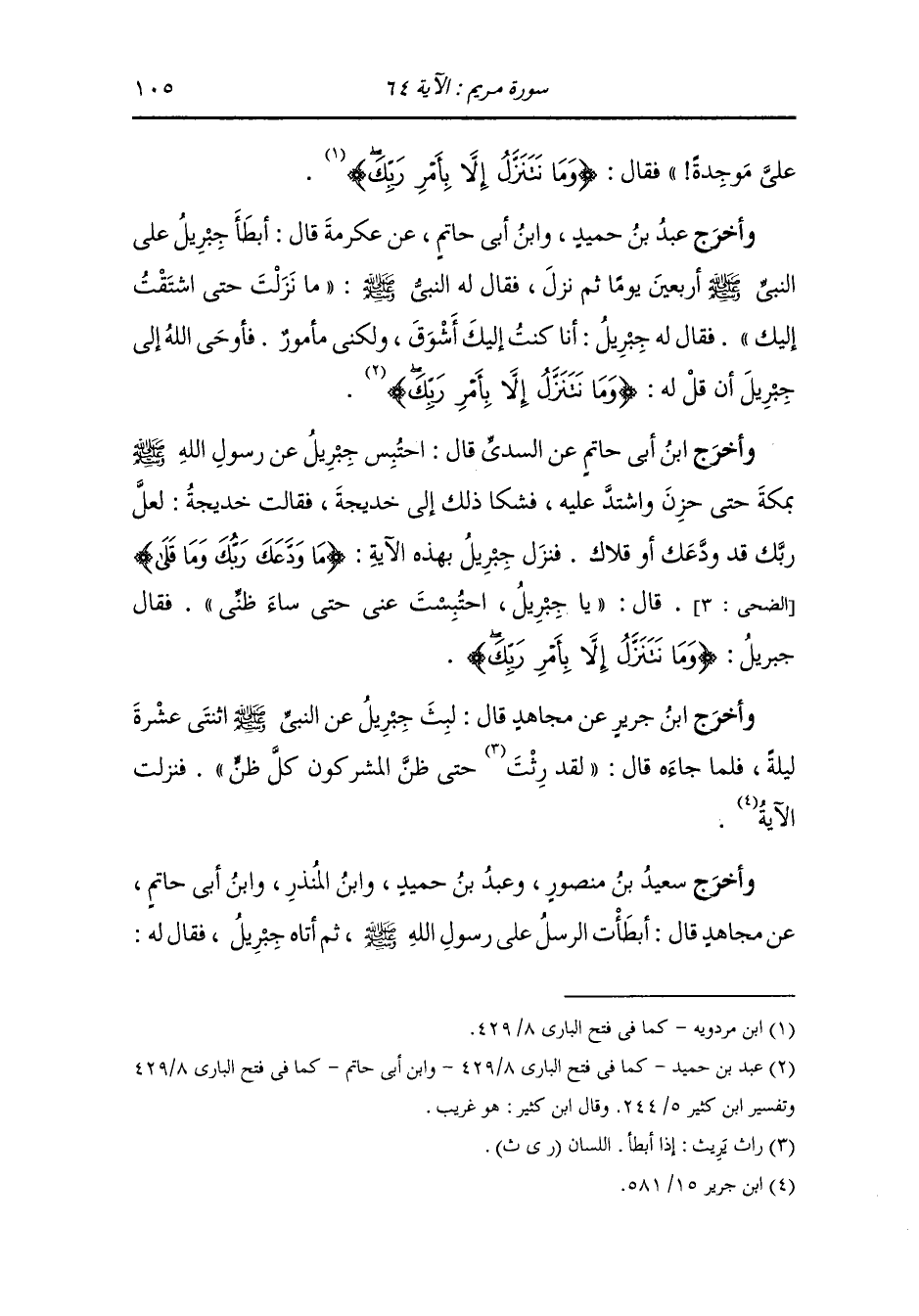 وأخرج عَبد بن حُمَيد ، وَابن ابي حاتم عن عكرمة قال : أبطأ جبريل على النَّبِيّ صلى الله عليه وسلم أربعين يوما ثم نزل فقال له النَّبِيّ صلى الله عليهه وسلم : ما نزلت حتى اشتقت إليك فقال له جبريل : أنا كنت إليك أشوق ولكني مأمور فأوحى الله إلى جبريل أن قل له : {وما نتنزل إلا بأمر ربك}.