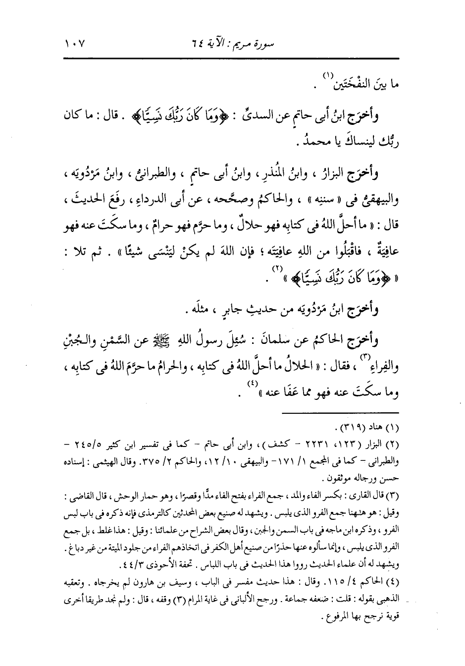 وأخرج ابن المنذر ، وَابن أبي حاتم والبزار والطبراني ، وَابن مردويه والبيهقي في "سُنَنِه" والحاكم وصححه عن أبي الدرداء رفع الحديث قال : ما أحل الله في كتابه فهو حلال وما حرم فهو حرام وما سكت عنه فهو عافية فأقبلوا من الله عافيته فإن الله لم يكن لينسى شيئا ، ثم تلا {وما كان ربك نسيا}.
