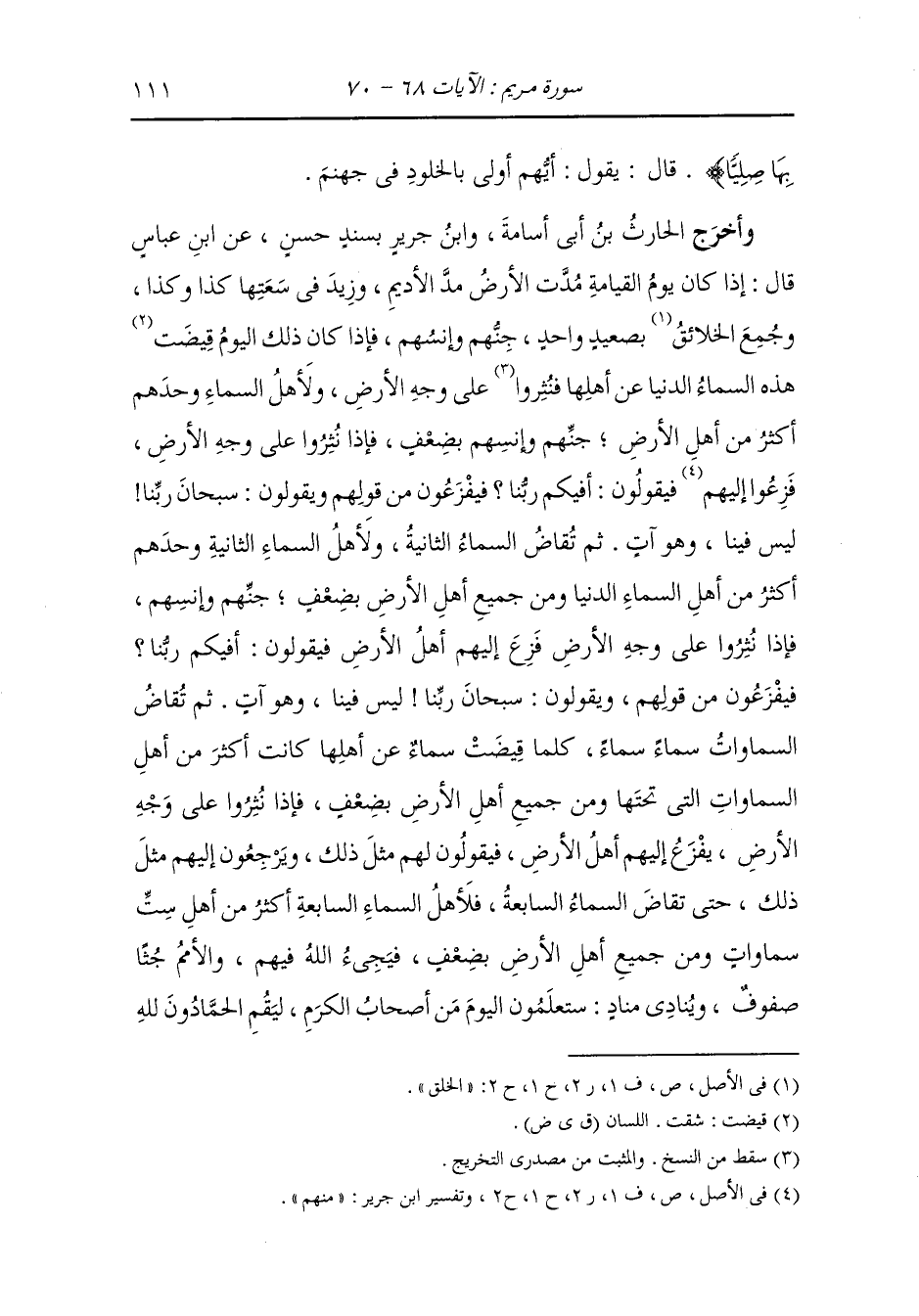 وأخرج الحرث بن أبي أسامة ، وَابن جَرِير بسند حسن عن ابن عباس قال : إذا كان يوم القيامة مدت الأرض مد الأديم وزيد في سعتها كذا وكذا وجمع الخلائق بصعيد واحد جنهم وإنسهم فإذا كان ذلك اليوم قيضت هذه السماء الدنيا عن أهلها على وجه الأرض ولأهل السماء وحدهم أكثر من أهل الأرض جنهم وإنسهم بضعف فإذا نثروا على وجه الأرض فزعوا إليهم فيقولون : أفيكم ربنا فيفزعون من قولهم ويقولون : سبحان ربنا ليس فينا وهو آت ، ثم تقاض السماء الثانية ولأهل السماء الثانية وحدهم أكثر من أهل السماء الدنيا ومن جميع أهل الأرض بضعف جنهم وإنسهم فإذا نثروا على وجه الأرض فزع إليهم أهل الأرض فيقولون : أفيكم ربنا فيفزعون من قولهم ويقولون : سبحان ربنا ليس فينا وهو آت ثم تقاض السموات : سماء سماء كلما قيضت سماء عن أهلها كانت أكثر من أهل السموات التي تحتها ومن جميع أهل الأرض بضعف فإذا نثروا على أهل الأرض يفزع إليهم أهل الأرض فيقولون لهم مثل ذلك فيرجعون إليهم مثل ذلك حتى تقاض السماء السابعة فلأهل السماء السابعة أكثر من أهل ست سموات ومن جميع أهل الأرض بضعف فيجيء الله فيهم والأمم جثي صفوف فينادي مناد : ستعلمون اليوم من أصحاب الكرم ليقم الحمادون لله