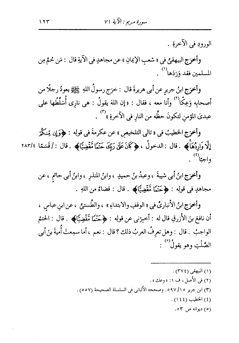 وأخرج ابن أبي حاتم من طريق مسلم بن جعفر البجلي قال : سمعت أبا معاذ البصري : أن عليا قال : قال النَّبِيّ صلى الله عليه وسلم : والذي نفسي بيده إنهم إذا خرجوا من قبورهم يستقبلون بنوق لها أجنحة عليها رحال الذهب شرك نعالهم نور تلألأ كل خطوة منها مد البصر فينتهون إلى شجرة ينبع من أصلها عينان فيشربون من أحداهما فيغسل ما في بطونهم من دنس ويغتسلون من الأخرى فلا تشعث أبشارهم ولا أشعارهم بعدها أبدا وتحري عليهم نضرة النعيم فيأتون باب الجنة فإذا حلقة من ياقوتة حمراء على صفائح الذهب فيضربون بالحلقة على الصفحة فيسمع لها طنين فيبلغ كل حوراء : أن زوجها قد اقبل فتبعث قيمها فيفتح له فإذا رآه خر له ساجدا فيقول : ارفع رأسك إنما أنا قيمك وكلت بأمرك فيتبعه ويقفو أثره فتستخف