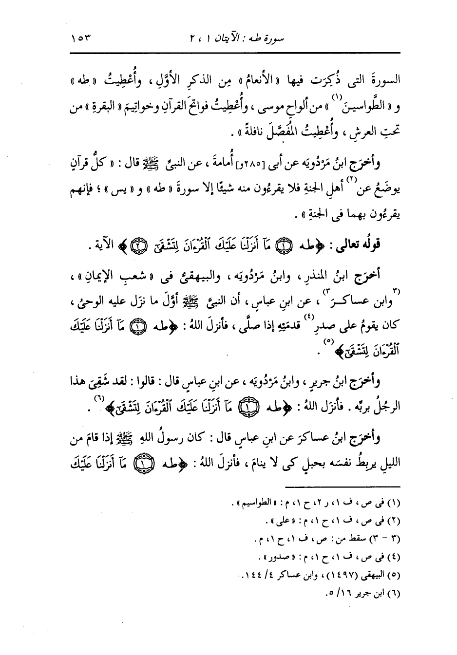 شعر مثل النيازك وعاد الشعبتان فهما مثل القليب الواسع فيه أضراس وأنياب لها صريف فلما عاين ذلك موسى (ولى مدبرا ولم يعقل) (النمل آية 10) فذهب حتى أمعن ورأى أنه قد أعجز الحية ثم ذكر ربه فوقف استحياء منه ثم {نودي يا موسى} أن ارجع حيث كنت فرجع وهو شديد الخوف فقال : خذها بيمينك ولا تخف سنعيدها سيرتها الأولى ، قال : وكان على موسى حينئذ مدرعة فجعلها في يده فقال له ملك : أرأيت يا موسى لو أذن الله بما تحاذر أكانت المدرعة تغني عنك شيئا قال : لا ، ولكني ضعيف ومن ضعف خلقت ، فكشف عن يده ثم وضعها على فم الحية ثم سمع حس الأضراس والأنياب ثم قبض فإذا هي عصاه التي عهدها وإذا يده في موضعها الذي