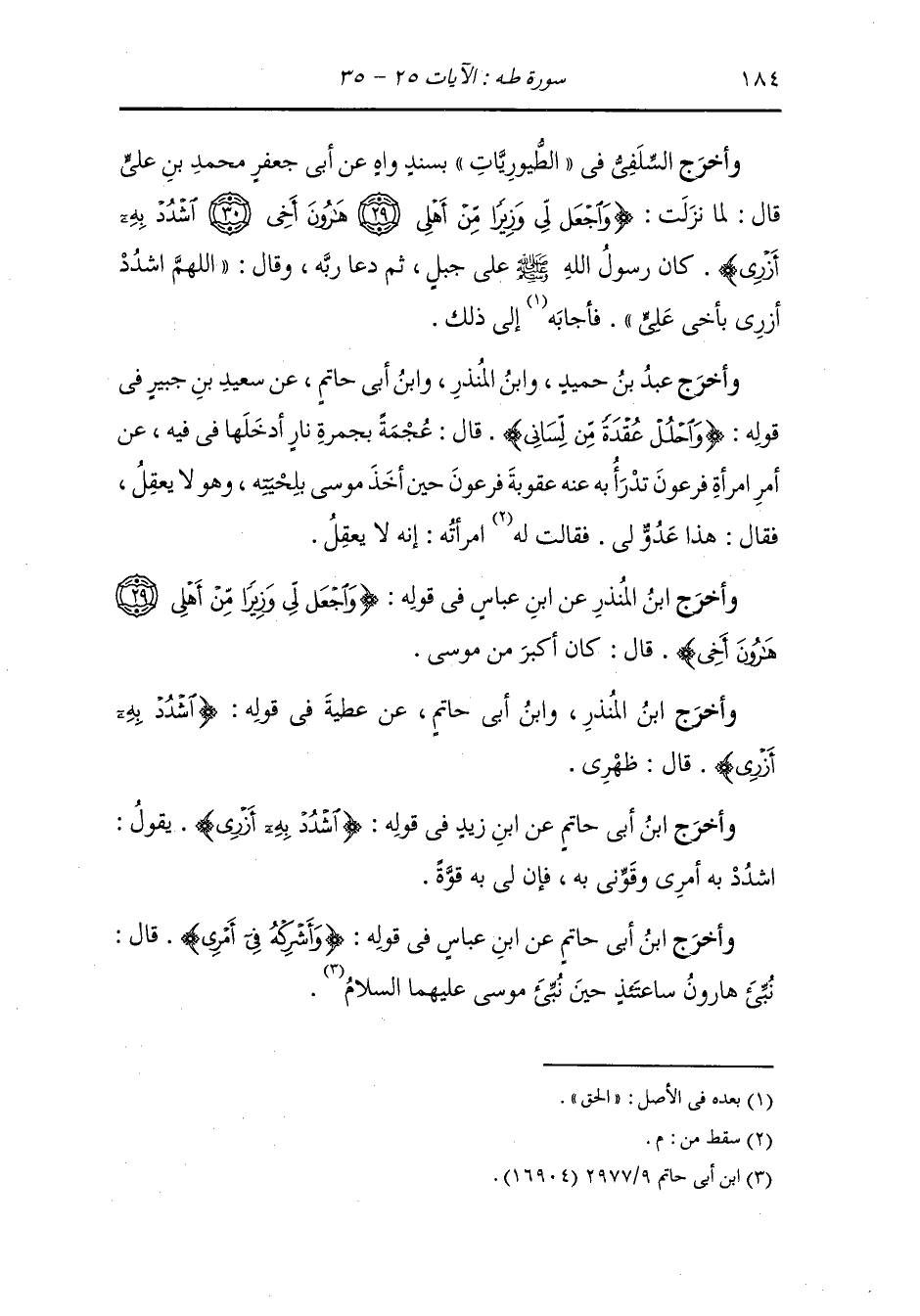 التي وعد فإنه قضى عشرا فأخبرت النصراني فقال : الذي أخبرك بهذا هو أعلم منك ، قلت : أجل وأولى (سار موسى بأهله) ورأى من أمر النار ما قص الله عليك في القرآن وأمر العصا ويده فشكا إلى ربه ما يتخوف من آل فرعون في القتيل وعقدة لسانه - فإنه كان في لسانه عقدة تمنعه من كثير من الكلام - فسأل ربه أن يعينه بأخيه هارون ليكون له ردءا ويتكلم عنه بكثير مما لا يفصح به فأتاه الله سؤله فحل عقدة من لسانه وأوحى إلى هارون وأمره أن يلقى موسى.