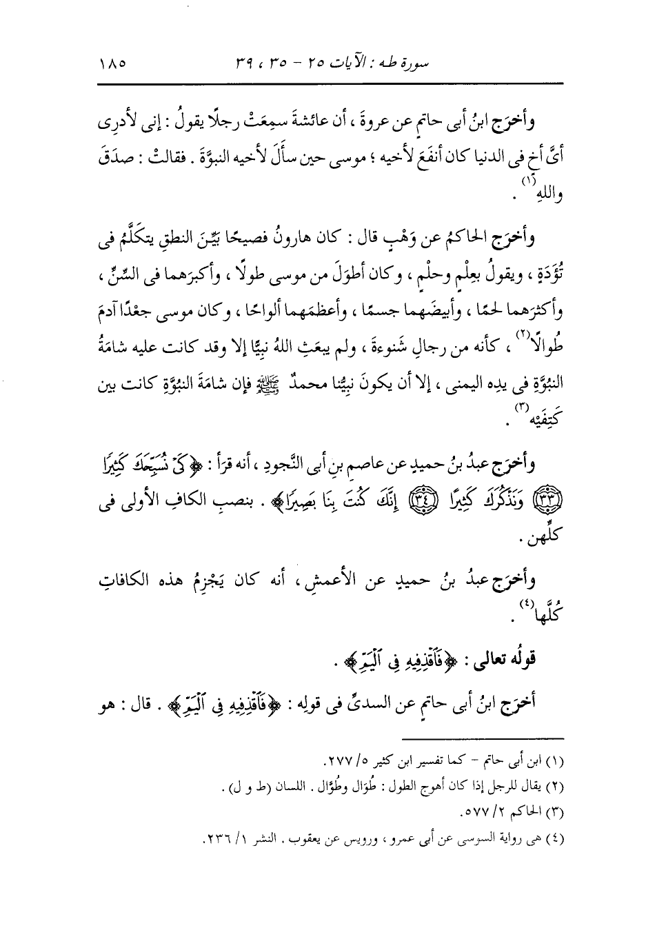 فاندفع موسى بالعصا ولقي هارون فانطلقا جميعا إلى فرعون فأقاما ببابه حينا لا يؤذن لهما ثم أذن لهما بعد حجاب شديد فقالا : {إنا رسولا ربك} فقال : {فمن ربكما يا موسى} فأخبراه بالذي قص الله في القرآن ، قال : فما تريدان وذكره بالقتيل فاعتذر بما قد سمعت قال : أريد أن تؤمن بالله وترسل معي بني إسرائيل ، فأبى عليه ذلك وقال : ائت بآية إن كنت من الصادقين فألقى بعصاه فتحولت حية عظيمة فاغرة فاها مسرعة إلى فرعون - فلما رأى فرعون أنها قاصدة إليه - خافها فاقتحم عن سريره واستغاث بموسى : أن يكفها عنه ففعل.