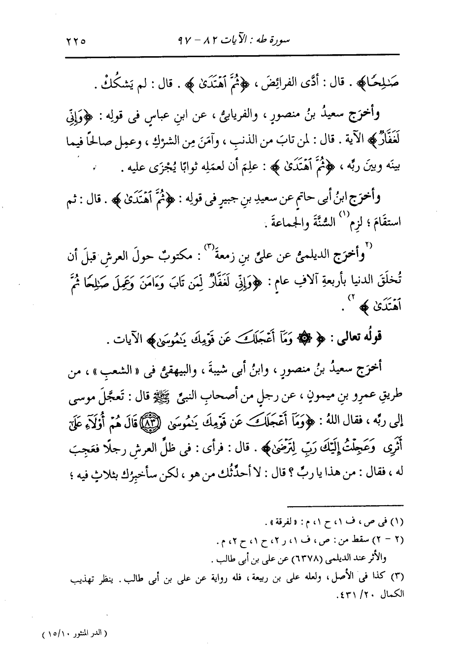 وأخرج عبد الرزاق ، وعَبد بن حُمَيد ، وَابن المنذر عن قتادة في قوله : {صفصفا} قال : القاع : الأرض والصفصف : المستوية {لا ترى فيها عوجا} قال : صدعا ، {ولا أمتا} قال : أكمة.