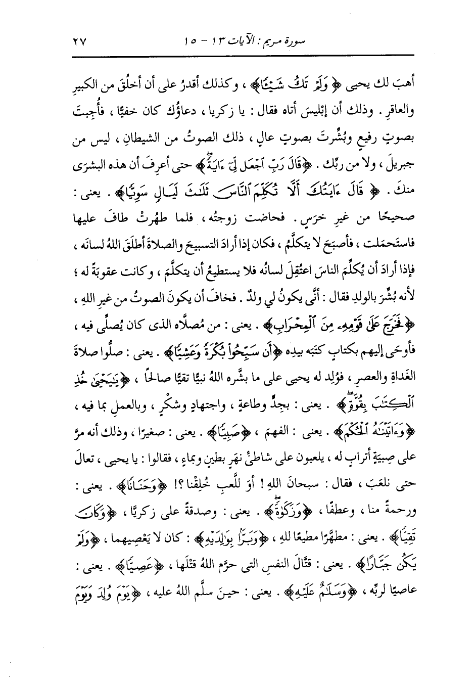 أهب لك يحيى {ولم تك شيئا} وكذلك أقدر على أن أخلق من الكبير والعاقر ، وذلك أن إبليس أتاه فقال : يا زكريا دعاؤك كان خفيا فأجبت بصوت رفيع وبشرت بصوت عال ذلك صوت من الشيطان ليس من جبريل ولا من ربك ، {قال رب اجعل لي آية} حتى أعرف أن هذه البشرى منك ، {قال آيتك ألا تكلم الناس ثلاث ليال} يعني صحيحا من غير خرس ، فحاضت زوجته فلما طهرت طاف عليها فاستحملت فأصبح لا يتكلم وكان إذا أراد التسبيح والصلاة أطلق الله لسانه فإذا أراد أن يكلم الناس أعتقل لسانه فلا يستطيع أن يتكلم وكانت عقوبة له لأنه بشر بالولد فقال : {أنى يكون لي غلام} فخاف أن يكون الصوت من غير الله {فخرج على قومه من المحراب} يعني من مصلاه الذي كان يصلي فيه ، فأوحى إليهم بكتاب كتبه بيده {أن سبحوا بكرة وعشيا} يعني صلوا صلاة الغداة والعصر فولد له يحيى على ما بشره الله نبيا تقيا صالحا {يا يحيى خذ الكتاب بقوة} يعني بجد وطاعة واجتهاد وشكر وبالعمل بما فيه {وآتيناه الحكم} يعني الفهم {صبيا} صغيرا وذلك أنه مر على صبية أتراب له يلعبون على شاطئ نهر بطين وبماء فقالوا : يا يحيى تعال حتى نلعب فقال : سبحان الله أو للعب خلقنا {وحنانا} يعني ورحمة {منا} وعطفا {وزكاة} يعني وصدقة على زكريا {وكان تقيا} يعني مطهرا مطيعا لله {وبرا بوالديه} كان لا يعصيهما {ولم يكن جبارا} يعني قتال النفس التي حرم الله قتلها {عصيا} يعني عاصيا لربه ، {وسلام عليه} يعني حين سلم الله عليه {يوم ولد ويوم يموت