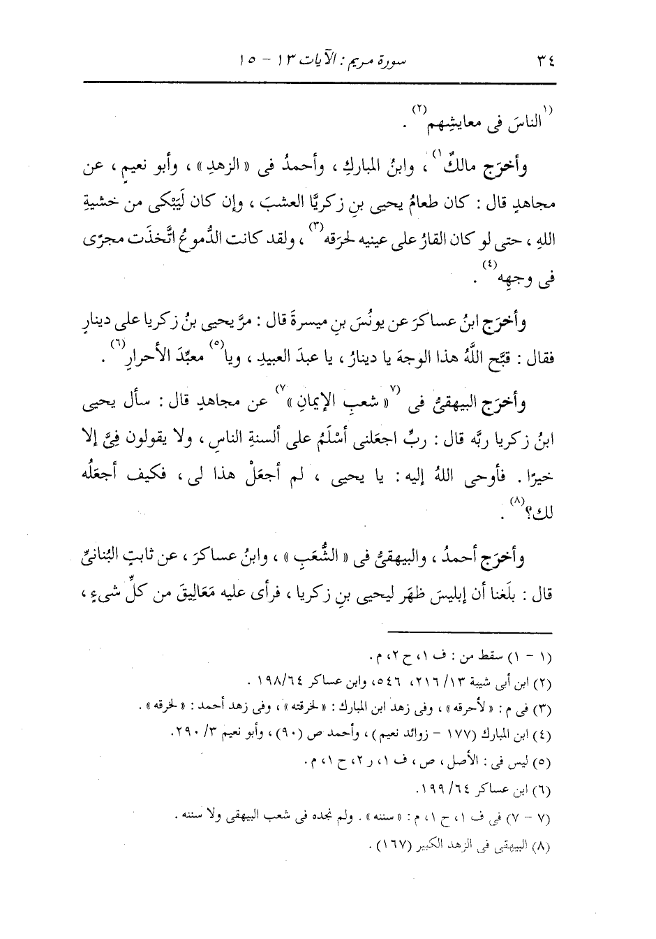 وأخرج أحمد والبيهقي في الشعب ، وَابن عساكر عن ثابت البناني قال : بلغنا أن إبليس ظهر ليحيى بن زكريا فرأى عليه معاليق من كل شيء