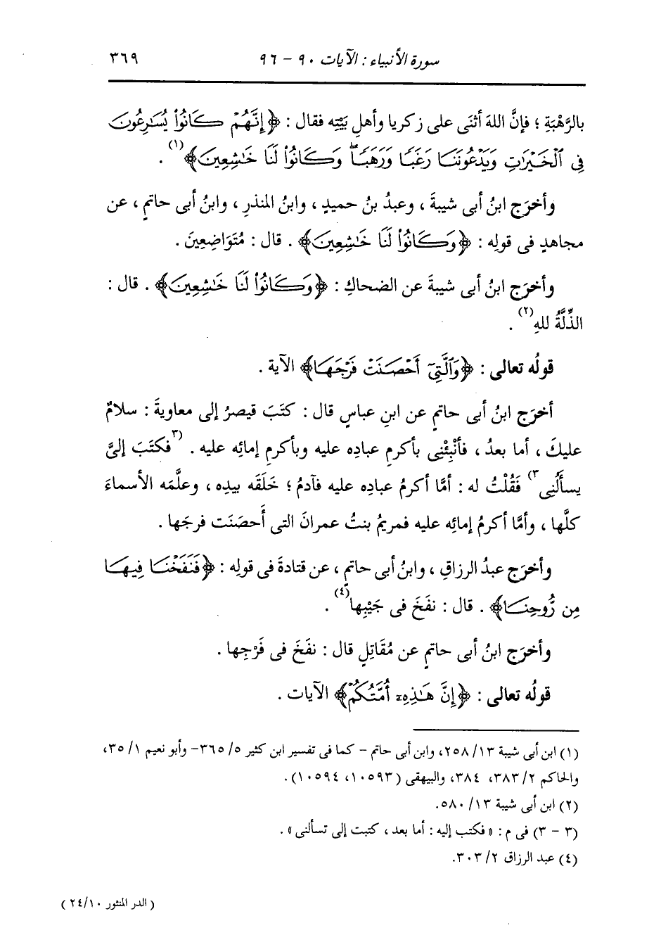 وأخرج ابن أبي حاتم عن عبد الله بن عمرو بن العاص قال : ما كان منذ كانت الدنيا رأس مائة سنة إلا كان عند رأس المائة أمر ، قال : فتحت يأجوج ومأجوج ، وهم كما قال الله : {من كل حدب ينسلون} فيأتي أولهم على نهر عجاج فيشربونه كله حتى ما يبقى منه قطرة ويأتي آخرهم فيمر فيقول : قد كان ههنا مرة ماء فيفسدون في الأرض ويحاصرون المؤمنين في مدينة إليا فيقولن : لم يبق في الأرض أحد إلا قد ذبحناه ، هلموا نرمي من في السماء ، فيرمون في السماء فترجع إليهم سهامهم في نصلها الدم فيقولون : ما بقي في الأرض ولا في السماء أحد إلا وقد قتلناه ، فيقول المؤمنون : يا روح الله ادع الله عليهم ، فيدعو عليهم فيبعث الله في آذانهم النغف فيقتلهم جميعا في ليلة واحدة حتى تنتن الأرض من جيقهم فيقول المؤمنون : يا روح الله ادع الله فإنا نخشى أن نموت من نتن جيفهم ، فيدعو الله فيرسل عليهم وابلا من السماء فيجعلهم سيلا فيقذفهم في البحر.