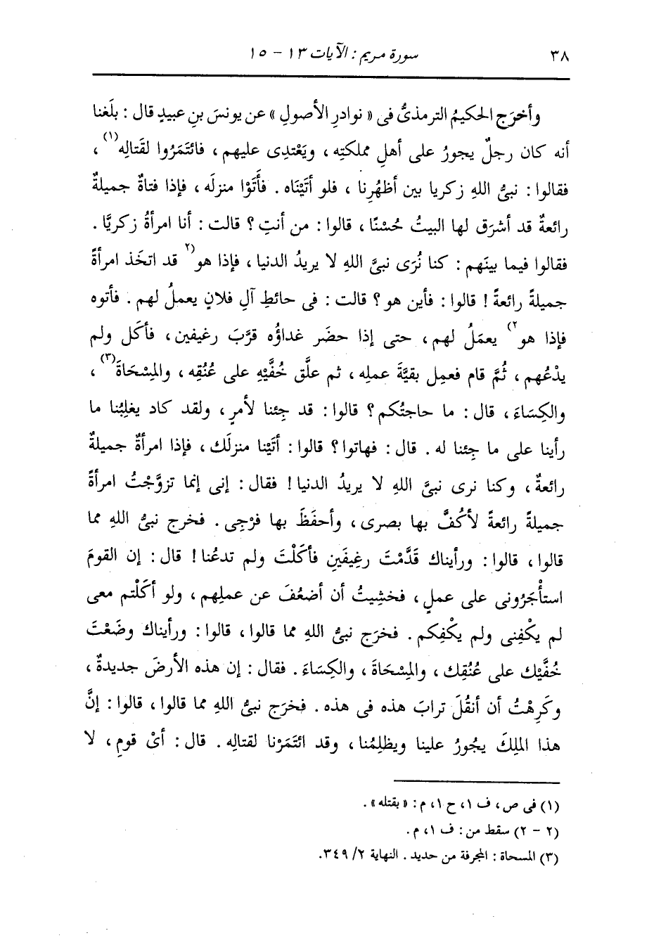 فقالوا : من أنت قالت : امرأة زكريا ، فقالوا فيما بينهم : كنا نرى نبي الله لا يريد الدنيا فإذا هو عنده امرأة من أجمل النساء ثم إنهم رأوه في عمل عند قوم ويعمل لهم حتى إذا حضر غداؤه قرب رغيفين فأكل ولم يدعهم ثم قام فعمل بقية عمله ثم علق خفيه على عنقه والمسحاة والكساء قال : ما حاجتكم قالوا : قد جئنا لأمر ولقد كاد يغلبنا ما رأينا على ما جئنا له ، قال : فهاتوا قالوا : أتينا منزلك فإذا امرأة جميلة رائعة وكنا نرى نبي الله لا يريد الدنيا فقال : إني إنما تزوجت امرأة جميلة رائعة لأكف بها بصري وأحفظ بها فرجي فخرج نبي الله مما قالوا ، قالوا : ورأيناك قدمت رغيفين فأكلت ولم تدعنا قال : إن القوم استأجروني على عمل فخشيت أن أضعف عن عملهم ولو أكلتم معي لم يكفني ولم يكفكم فخرج نبي الله مما قالوا ، قالوا : ورأيناك وضعت خفيك على عنقك والمسحاة والكساء ، فقال : إن هذه الأرض جديدة وكرهت أن أنقل تراب هذه في هذه فخرج نبي الله مما قالوا ، قالوا : إن هذا الملك يجور علينا ويظلمنا وقد ائتمرنا لقتاله ، قال : أي قوم لا