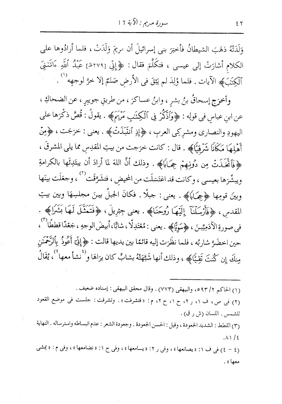 وأخرج إسحاق بن بشر ، وَابن عساكر من طريق جويبر عن الضحاك رضي الله عنه عن ابن عباس رضي الله عنهما في قوله : {واذكر في الكتاب مريم} يقول : قص ذكرها على اليهود والنصارى ومشركي العرب {إذ انتبذت} يعني خرجت {من أهلها مكانا شرقيا} قال : كانت خرجت من بيت المقدس مما يلي المشرق {فاتخذت من دونهم حجابا} وذلك أن الله لما أراد أن يبتدئها بالكرامة