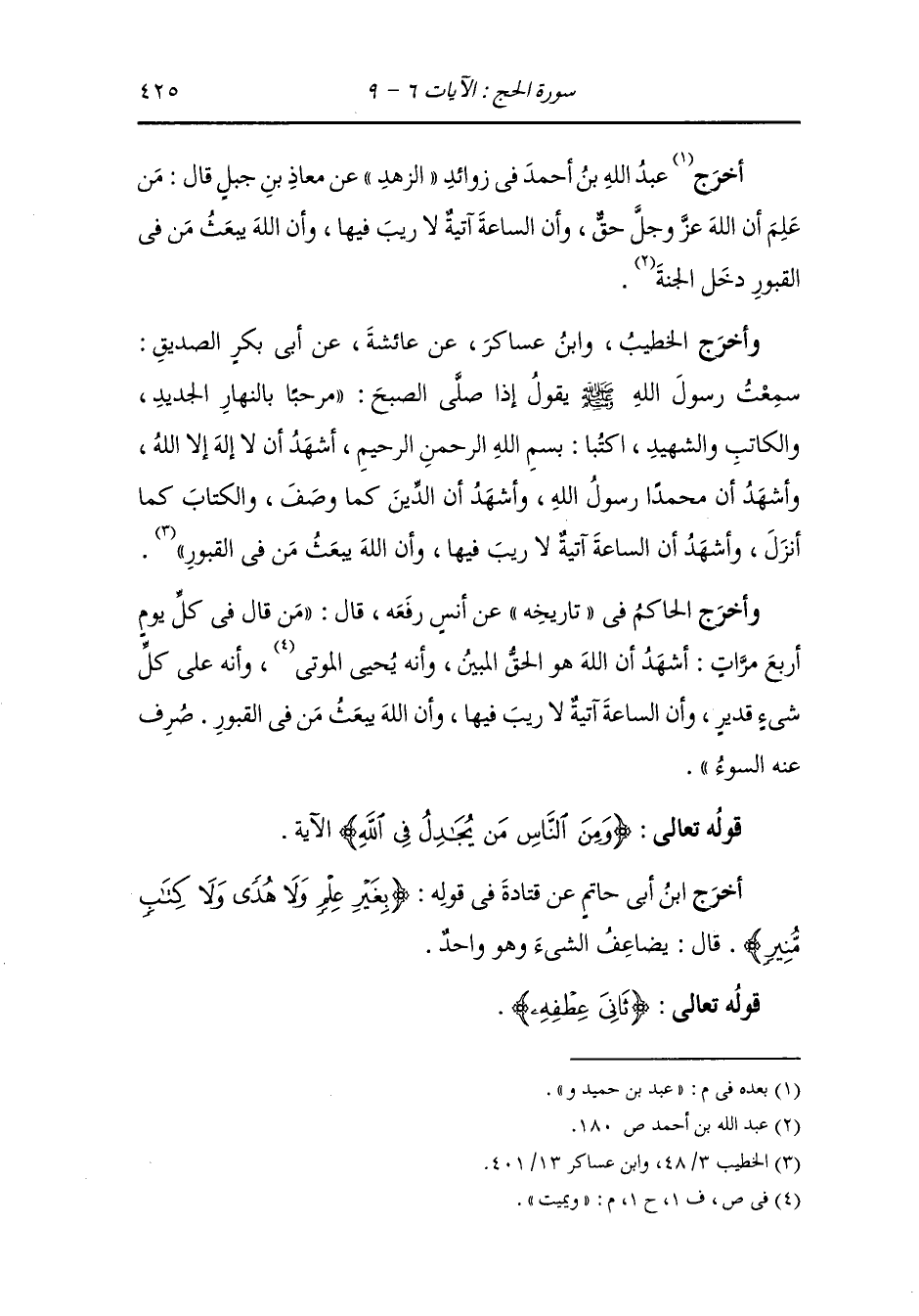 وأخرج ابن جرير عن عكرمة في قوله {هذان خصمان اختصموا في ربهم} قال : هما الجنة والنار اختصمتا فقالت النار : خلقني الله لعقوبته ، وقالت الجنة : خلقني الله لرحمته.