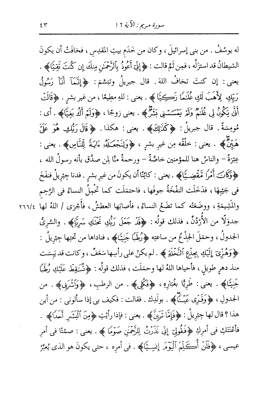 له يوسف من بني إسرائيل وكان من خدم بيت المقدس فخافت أن يكون الشيطان قد استزه فمن ثم قالت : {إني أعوذ بالرحمن منك إن كنت تقيا} يعني إن كنت تخاف الله ، قال جبريل : وتبسم {إنما أنا رسول ربك لأهب لك غلاما زكيا} يعني لله مطيعا من غير بشر ، {قالت أنى يكون لي غلام ولم يمسسني بشر} يعني زوجا {ولم أك بغيا} أي مومسة ، قال جبريل : {كذلك} يعني هكذا {قال ربك هو علي هين} يعني خلقه من غير بشر ، {ولنجعله آية للناس} يعني عبرة والناس هنا للمؤمنين خاصة ورحمة لكمن صدق بأنه رسول الله ، {وكان أمرا مقضيا} يعني كائنا أن يكون من غير بشر ، فدنا جبريل فنفخ في جيبها فدخلت النفخة جوفها فاحتملت كما تحمل النساء في الرحم والمشيمة ووضعته كما تضع النساء فأصابها العطش فأجرى الله لها جدولا من الأردن فذلك قوله : {قد جعل ربك تحتك سريا} والسري الجدول ، وحمل الجذع من ساعته {رطبا جنيا} فناداها من تحتها جبريل {وهزي إليك بجذع النخلة} لم يكن على رأسها سقف وكانت قد يبست منذ دهر طويل فأحياها الله لها وحملت فذلك قوله : {تساقط عليك رطبا جنيا} يعني طريا بغباره {فكلي} من الرطب {واشربي} من الجدول {وقري عينا} بولدك ، فقال : فكيف بي إذا سألوني من أين هذا ، ، قال لها جبريل : {فإما ترين} يعني فإذا رأيت {من البشر أحدا} فأعنتك في أمرك {فقولي إني نذرت للرحمن صوما} يعني صمتا في أمر عيسى {فلن أكلم اليوم إنسيا} في أمره ، حتى يكون هو الذي يعبر