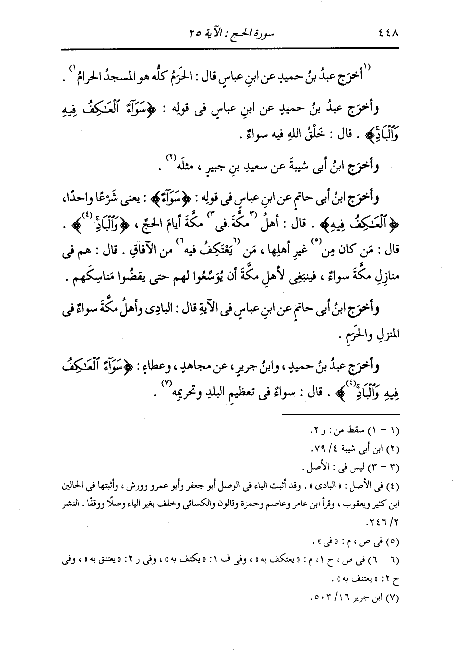 وأخرج ابن أبي حاتم عن حوشب بن عقيل قال : سألت محمد بن عباد بن جعفر : متى كان البيت قال : خلقت الأشهر له ، قلت : كم كان طول بناء إبراهيم قال : ثمانية عشر ذراعا ، قلت : كم هو اليوم قال : ستة وعشرون ذراعا : قلت : هل بقي من حجارة بناء إبراهيم شيء قال : حشي به البيت إلا حجرين مما يليا الحجر.