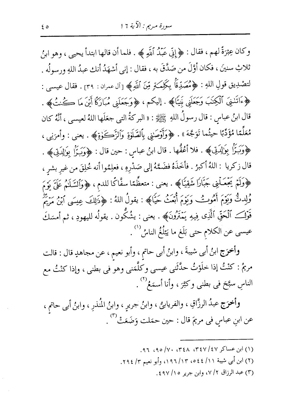 وأخرج ابن أبي شيبة عن أبي حاتم وأبو نعيم عن مجاهد رضي الله عنه قال : قالت مريم : كنت إذا خلوت حدثني عيسى وكلمني وهو في بطني وإذا كنت مع الناس سبح في بطني وكبر وأنا أسمع.