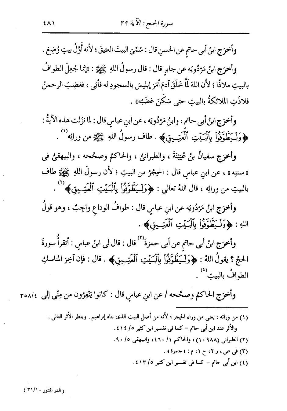 أخرج ابن أبي حاتم عن مقاتل {الذين إذا ذكر الله وجلت قلوبهم} عند ما يخوفون {والصابرين على ما أصابهم} من البلاء والمصيبات {والمقيمي الصلاة} يعني إقامتها بأداء ما استحفظهم الله فيها.