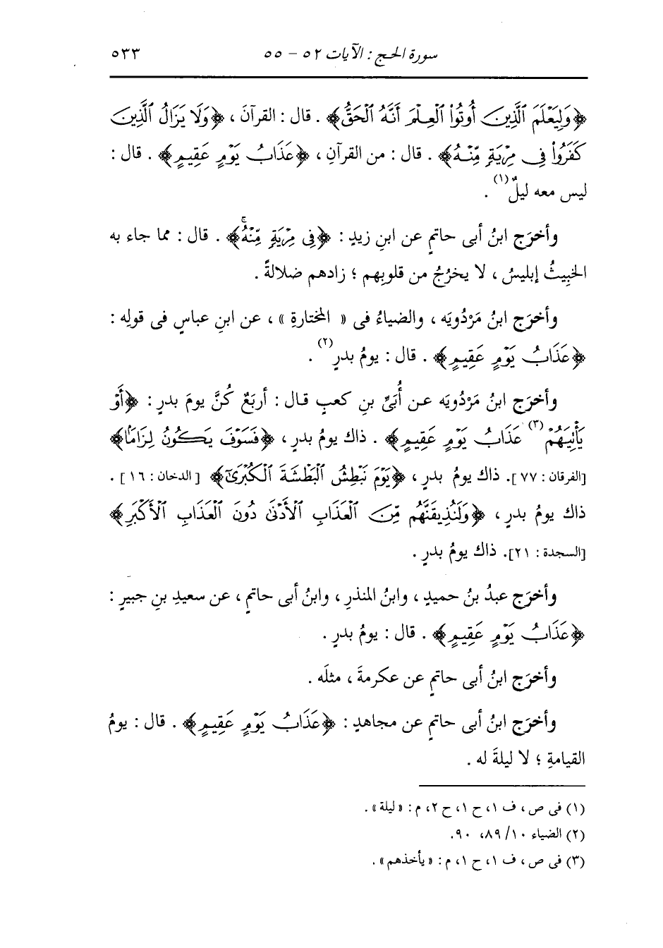 وأخرج البيهقي في "سُنَنِه" عن محمد بن زيد بن عبد الله بن عمر قال : قرأ عمر بن الخطاب هذه الآية {وما جعل عليكم في الدين من حرج} ثم قال : ادعوا لي رجلا من بني مدلج ، قال عمر : ما الحرج فيكم قال : الضيق.
