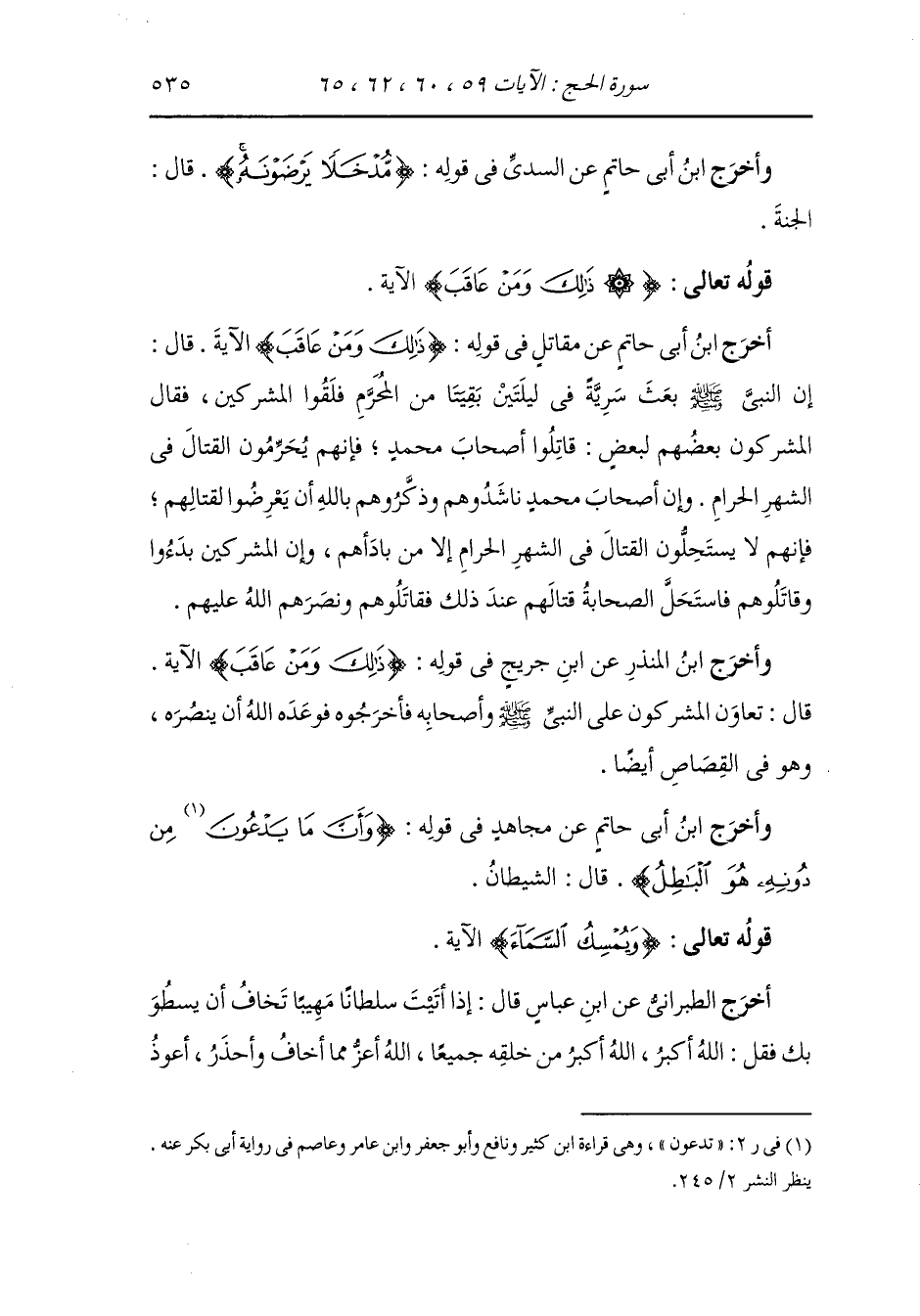 وأخرج ابن جرير ، وَابن المنذر ، وَابن أبي حاتم من طرق عن ابن عباس في قوله {هو سماكم المسلمين من قبل} قال الله عز وجل {سماكم}.