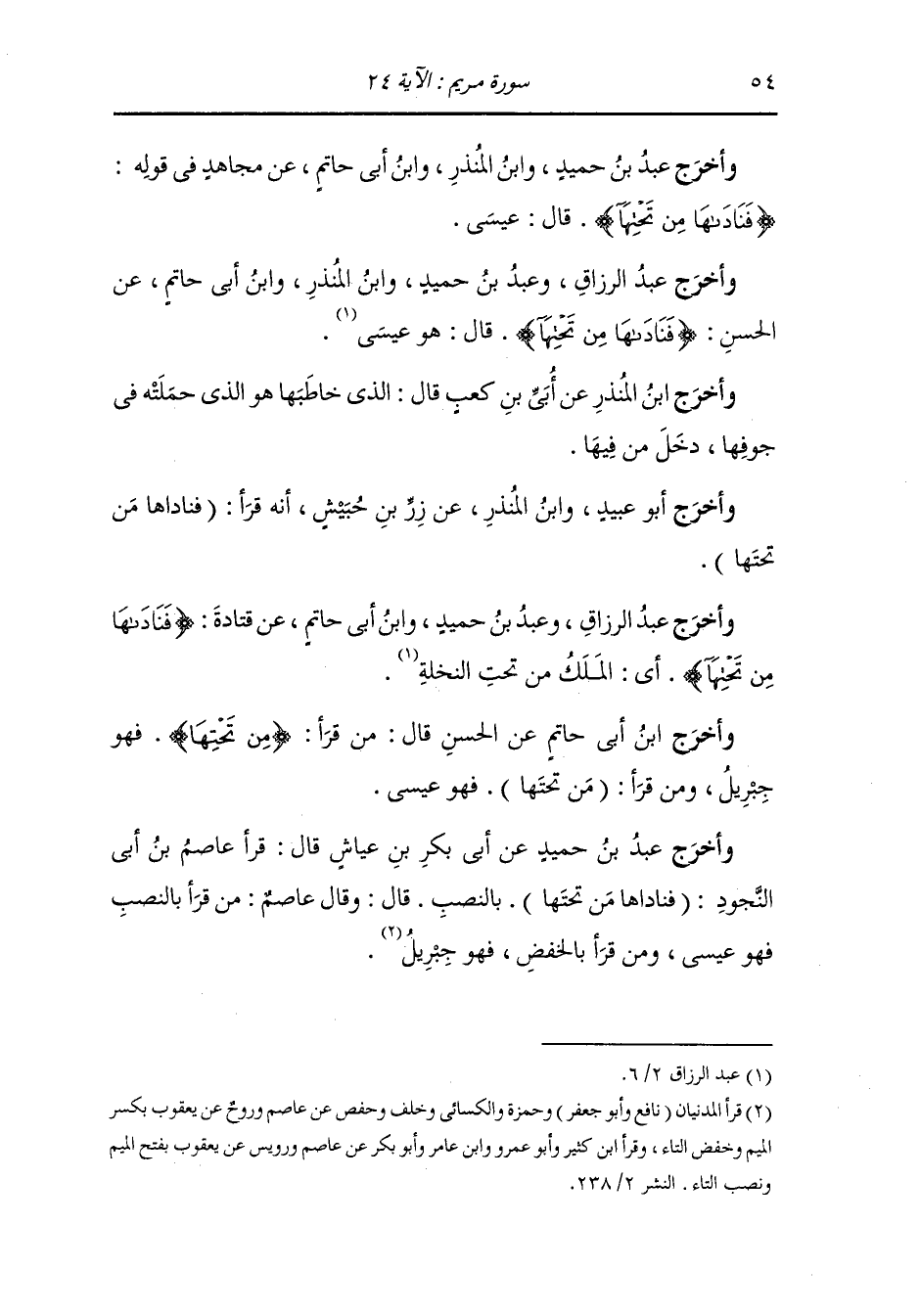 وأخرج عَبد بن حُمَيد عن أبي بكر بن عياش قال : قرأ عاصم بن أبي النجود {فناداها من تحتها} بالنصب قال : وقال عاصم : من قرأ بالنصب فهو عيسى ومن قرأها بالخفض فهو جبريل.