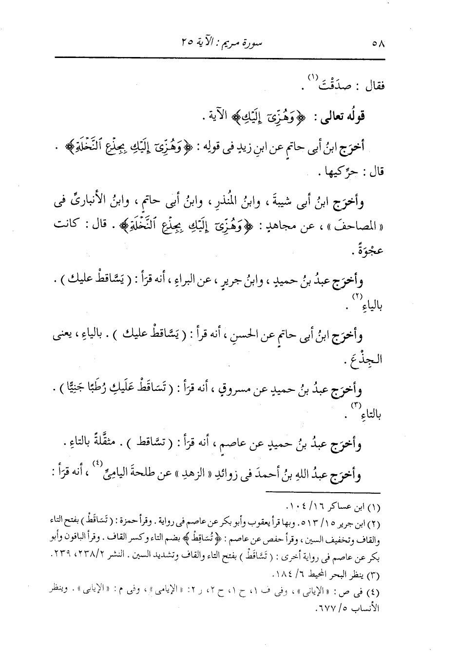 وأخرج عَبد بن حُمَيد عن عاصم أنه قرأ {تساقط} مثقلة بالتاء.