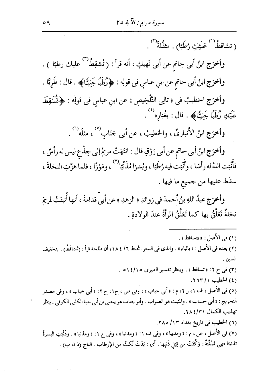 وأخرج ابن أبي حاتم عن ابن عباس في قوله : {رطبا جنيا} قال : طريا.
