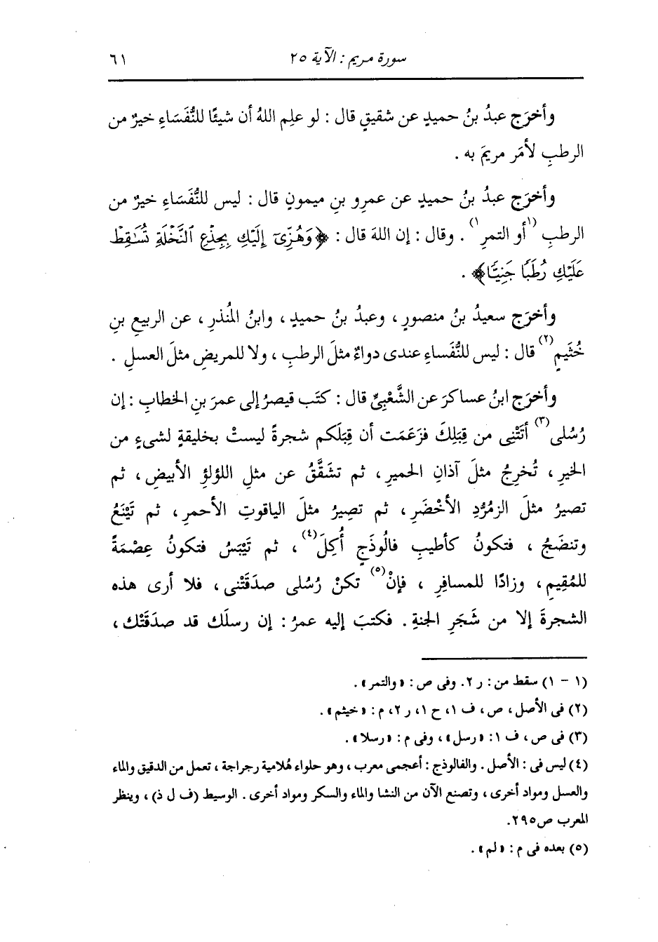 وأخرج عَبد بن حُمَيد عن عمرو بن ميمون قال ليس للنفساء خير من الرطب أو التمر وقال : إن الله قال : {وهزي إليك بجذع النخلة تساقط عليك رطبا جنيا}.