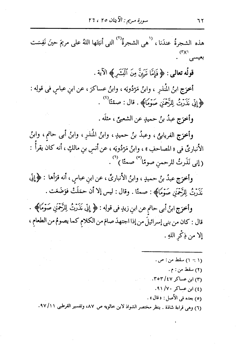 أخرج ابن مردويه ، وَابن المنذر ، وَابن عساكر عن ابن عباس في قوله : {إني نذرت للرحمن صوما} قال : صمتا.