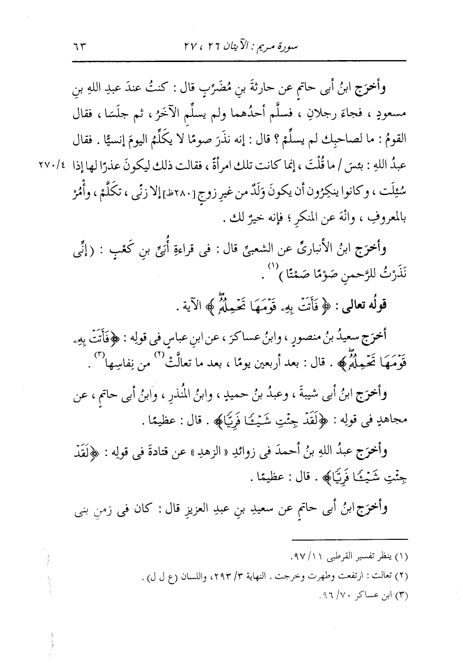 وأخرج ابن أبي حاتم عن حارثة بن مضرب قال : كنت عند ابن مسعود فجاء رجلان فسلم أحدهما ولم يسلم الآخر ثم جلسا ، فقال القوم : ما لصاحبك لم يسلم قال : إنه نذر صوما لا يكلم اليوم إنسيا ، فقال عبد الله : بئس ما قلت إنما كانت تلك المرأة فقالت ذلك ليكون عذرا لها إذا سئلت - وكانوا ينكرون أن يكون ولد من غير زوج إلا زنا - فتكلم وأمر بالمعروف وإنه عن المنكر فإنه خير لك.