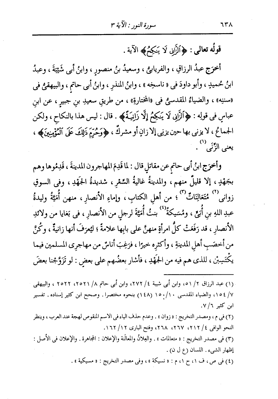 وأخرج البخاري ومسلم ، وَابن مردويه من طريق سعيد بن جبير عن ابن عباس قال : جاء رجل إلى النَّبِيّ صلى الله عليه وسلم فقال : ان امرأتي زنت ، وسكت رسول الله صلى الله عليه وسلم كأنه منكس في الأرض ثم رفع رأسه فقال : قد أنزل الله فيك وفي صاحبتك فائت بها ، فجاءت فقال : قم فاشهد أربع شهادات فقام فشهد أربع شهادات بالله أنه لمن الصادقين ، فقال له : ويلك أو ويحك انها موجبة ، فشهد الخامسة ان لعنة الله عليه ان كان من الكاذبين ، ثم قامت امرأته فشهدت أربع شهادات بالله أنه لمن الكاذبين ، ثم قال ويلك أو